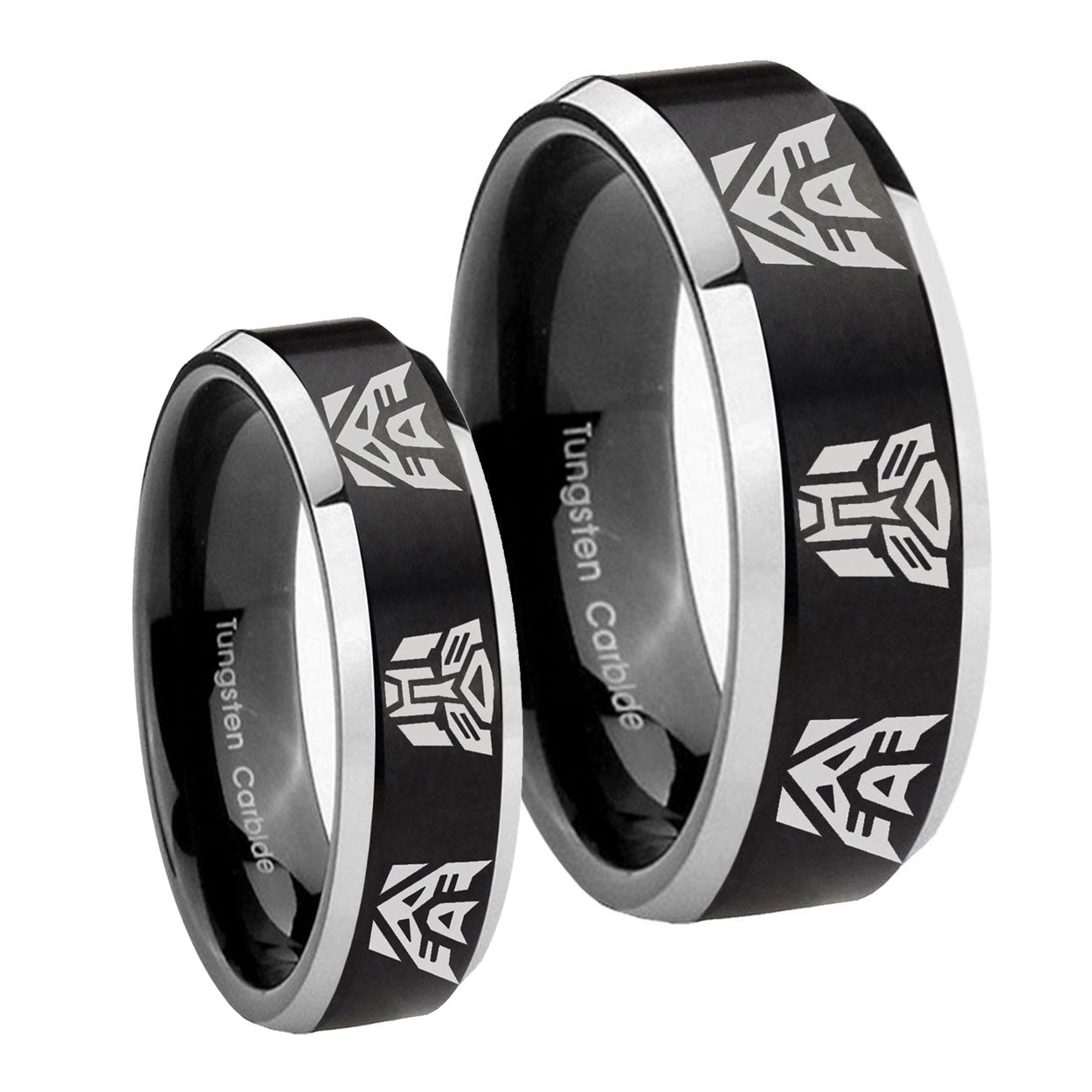 His Hers Transformers Autobot Decepticon Beveled Brush Black 2 Tone Tungsten Ring Set