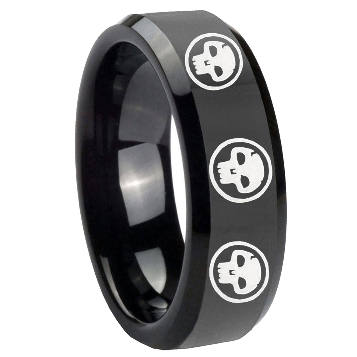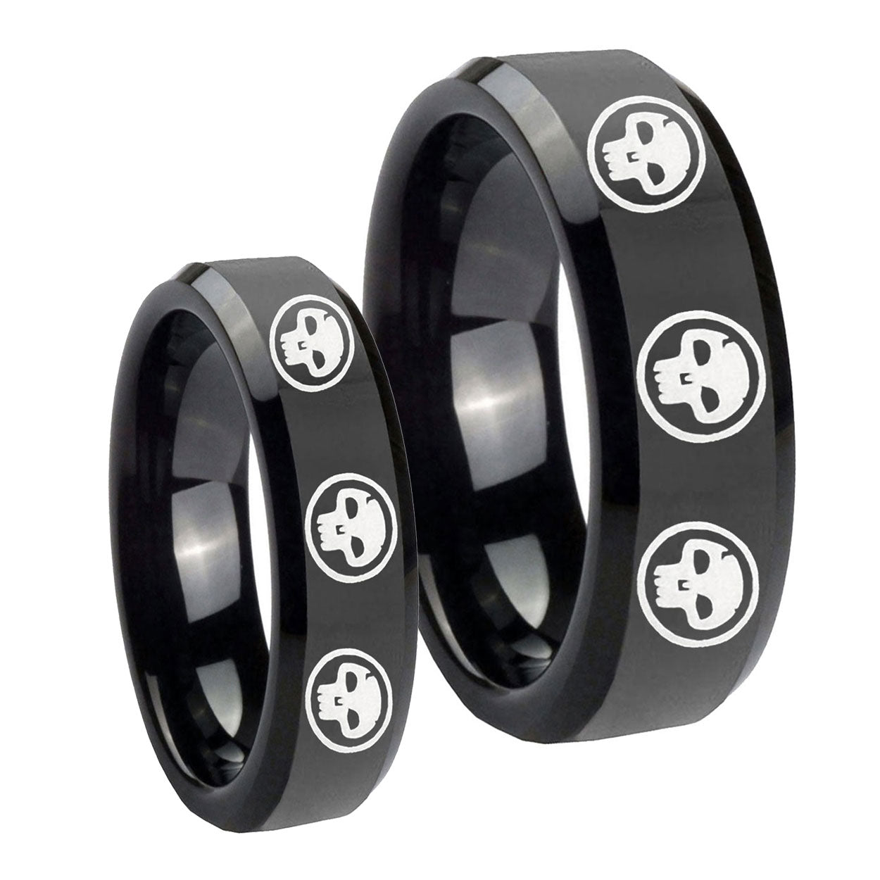 His Hers Multiple Skull Beveled Edges Black Tungsten Custom Ring for Men Set