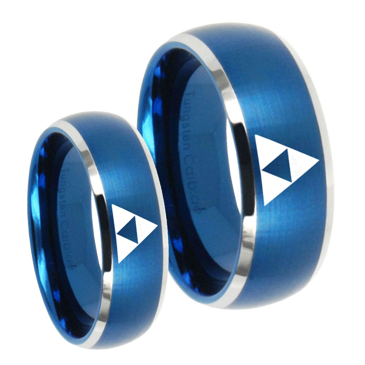 His Hers Zelda Triforce Dome Brushed Blue 2 Tone Tungsten Men's Band Ring Set