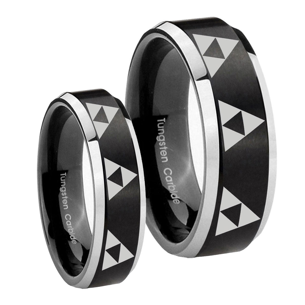 His Hers Multiple Zelda Triforce Beveled Brush Black 2 Tone Tungsten Rings for Men Set