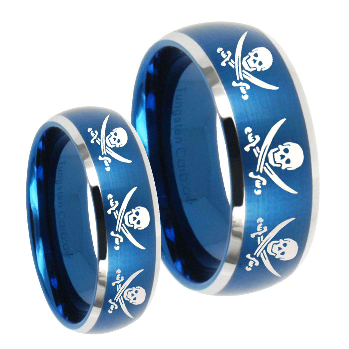 His Hers Multiple Skull Pirate Dome Brushed Blue 2 Tone Tungsten Men's Ring Set