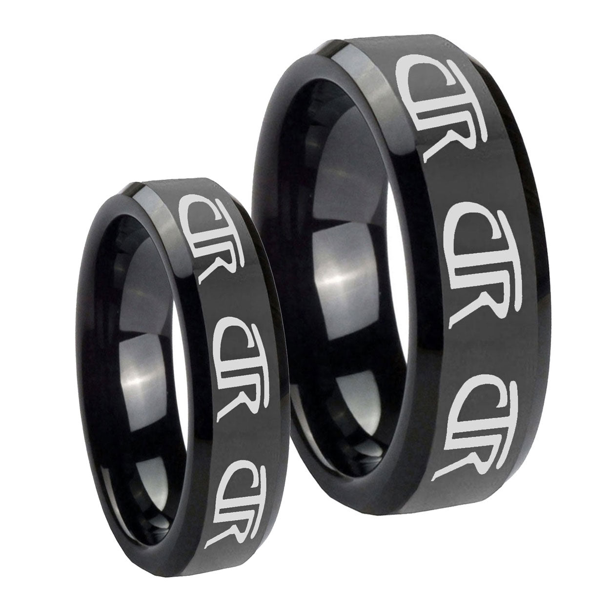 His Hers Multiple CTR Beveled Edges Black Tungsten Wedding Bands Ring Set