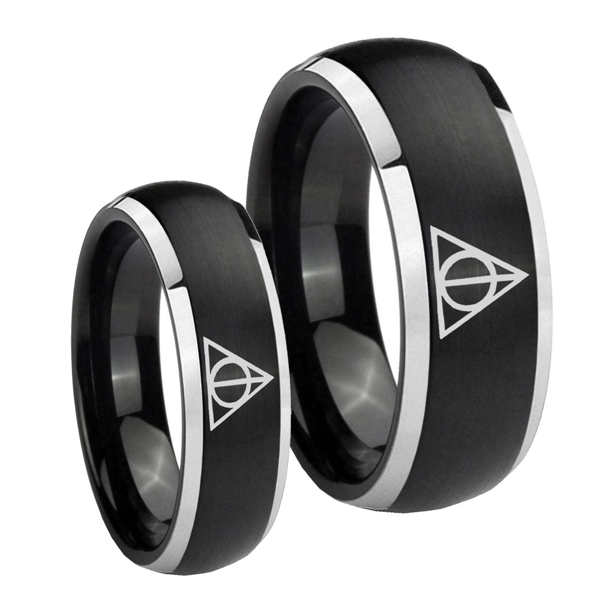 His Hers Deathly Hallows Dome Brushed Black 2 Tone Tungsten Mens Band Set