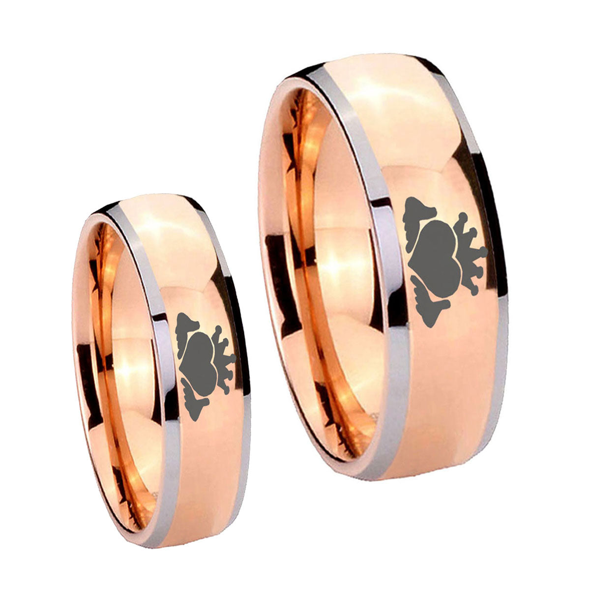 Bride and Groom Claddagh Design Dome Rose Gold Tungsten Carbide Men's Ring Set
