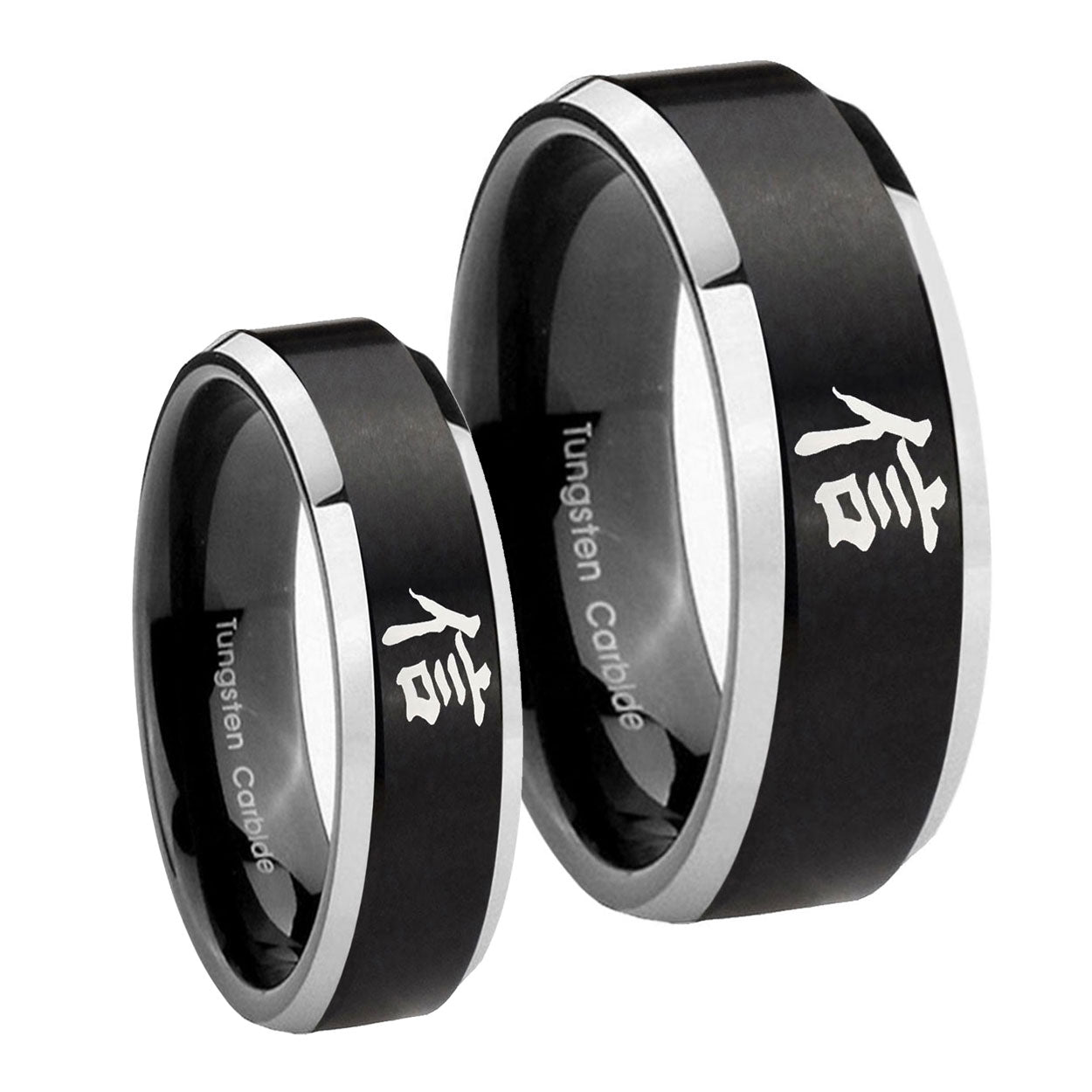 His Hers Kanji Faith Beveled Brush Black 2 Tone Tungsten Men's Band Set