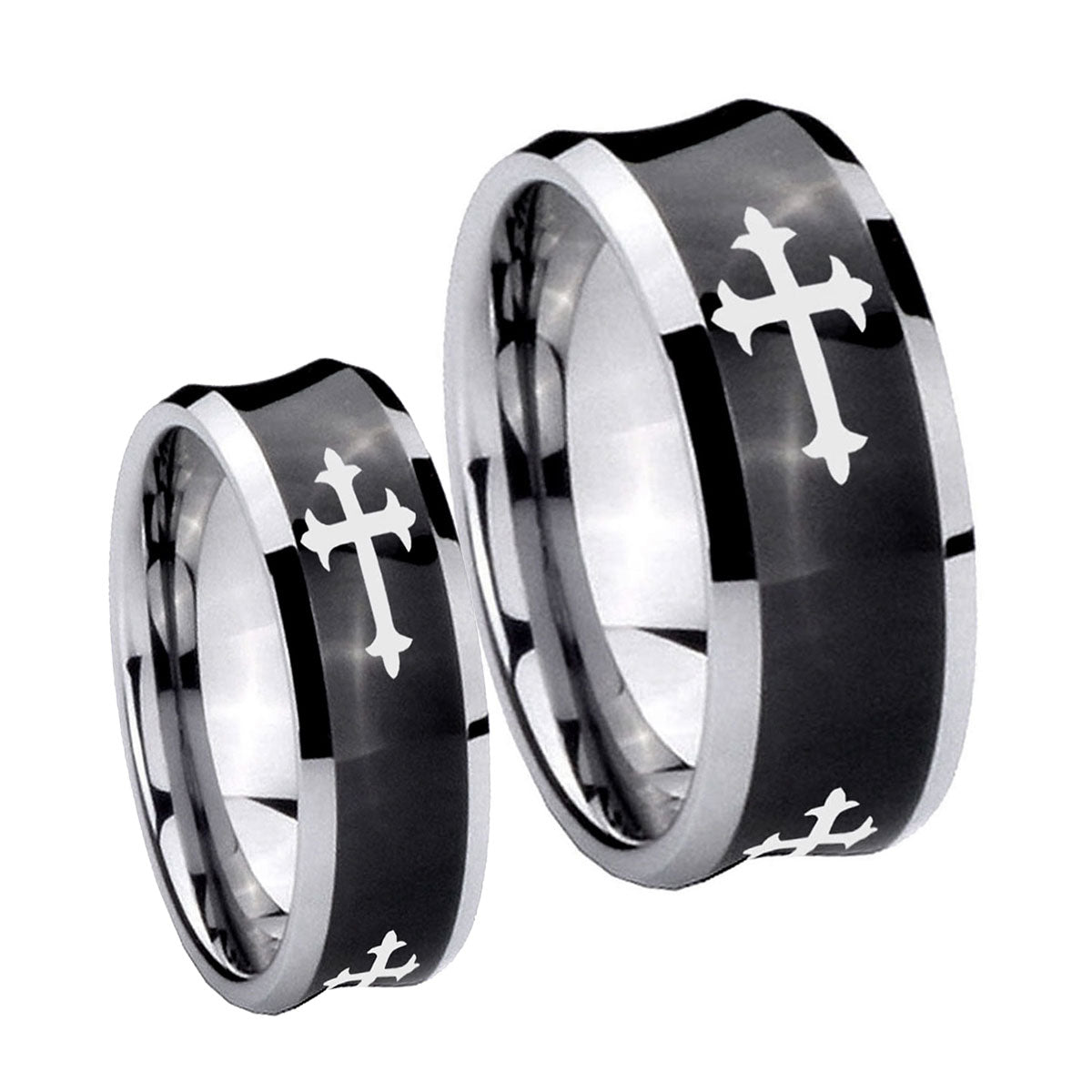 His and Hers Christian Cross Religious Concave Black Tungsten Mens Ring Engraved Set
