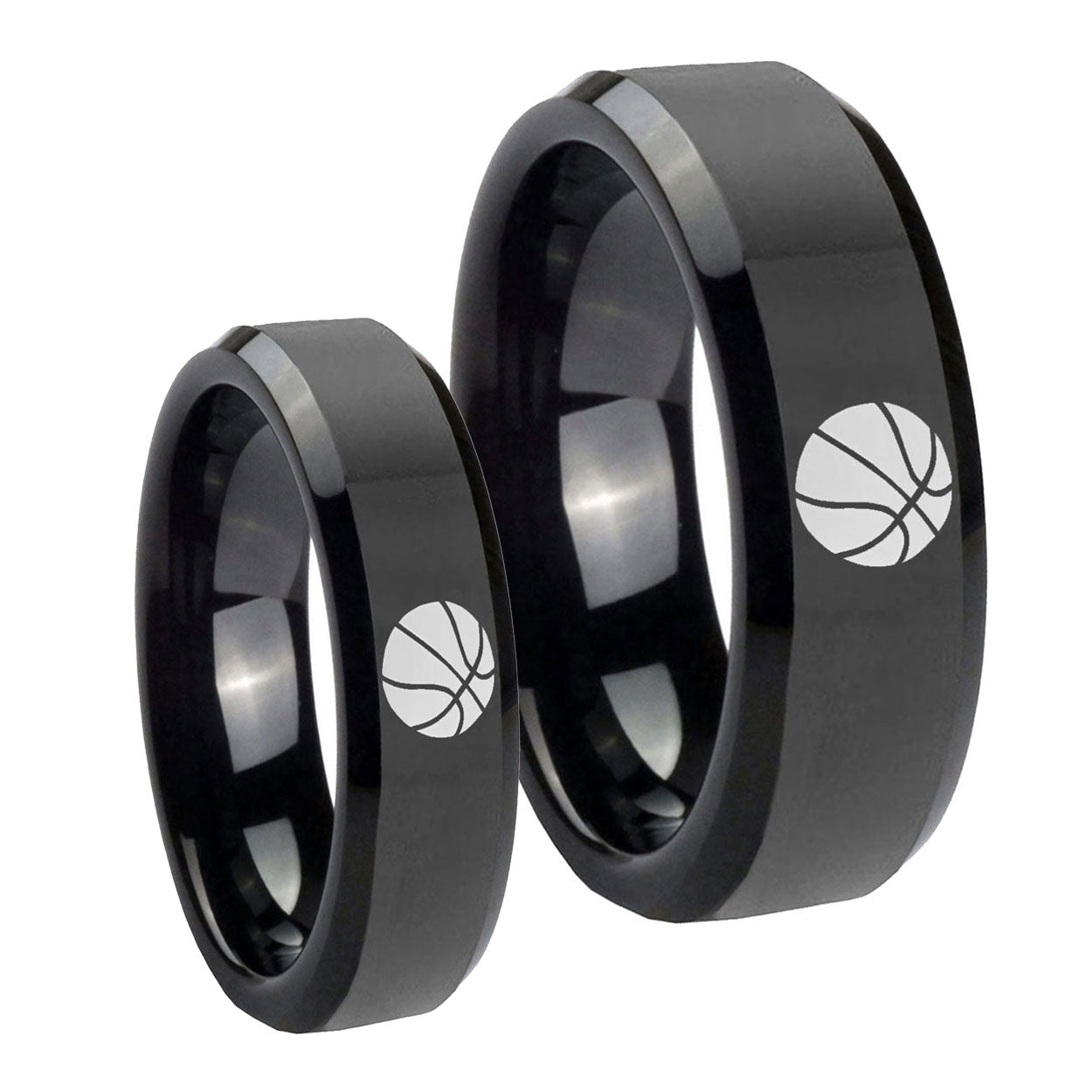 His Hers Basketball Beveled Edges Black Tungsten Men's Wedding Ring Set
