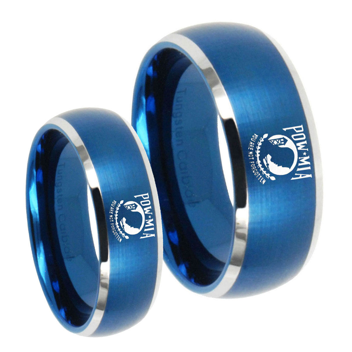 His Hers Military Pow Dome Brushed Blue 2 Tone Tungsten Custom Ring for Men Set