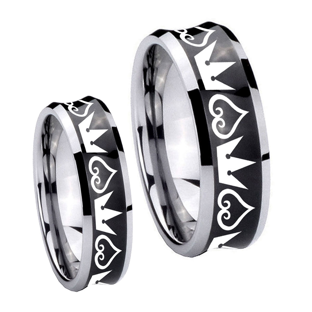 Bride and Groom Hearts and Crowns Concave Black Tungsten Carbide Bands Ring Set