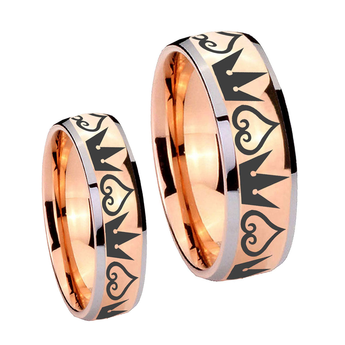 His Hers Hearts and Crowns Dome Rose Gold Tungsten Mens Ring Engraved Set