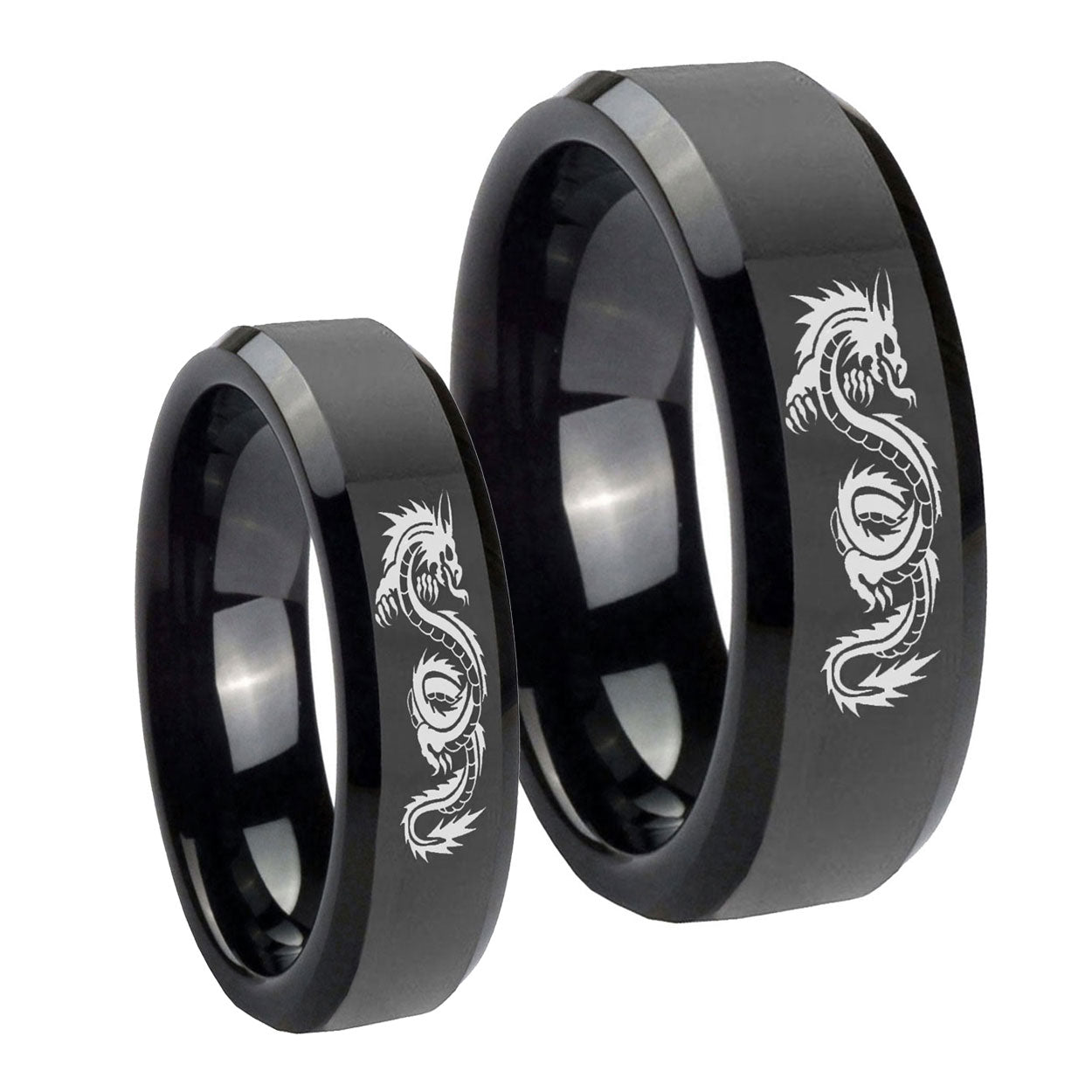 His and Hers Dragon Beveled Edges Black Tungsten Men's Wedding Band Set