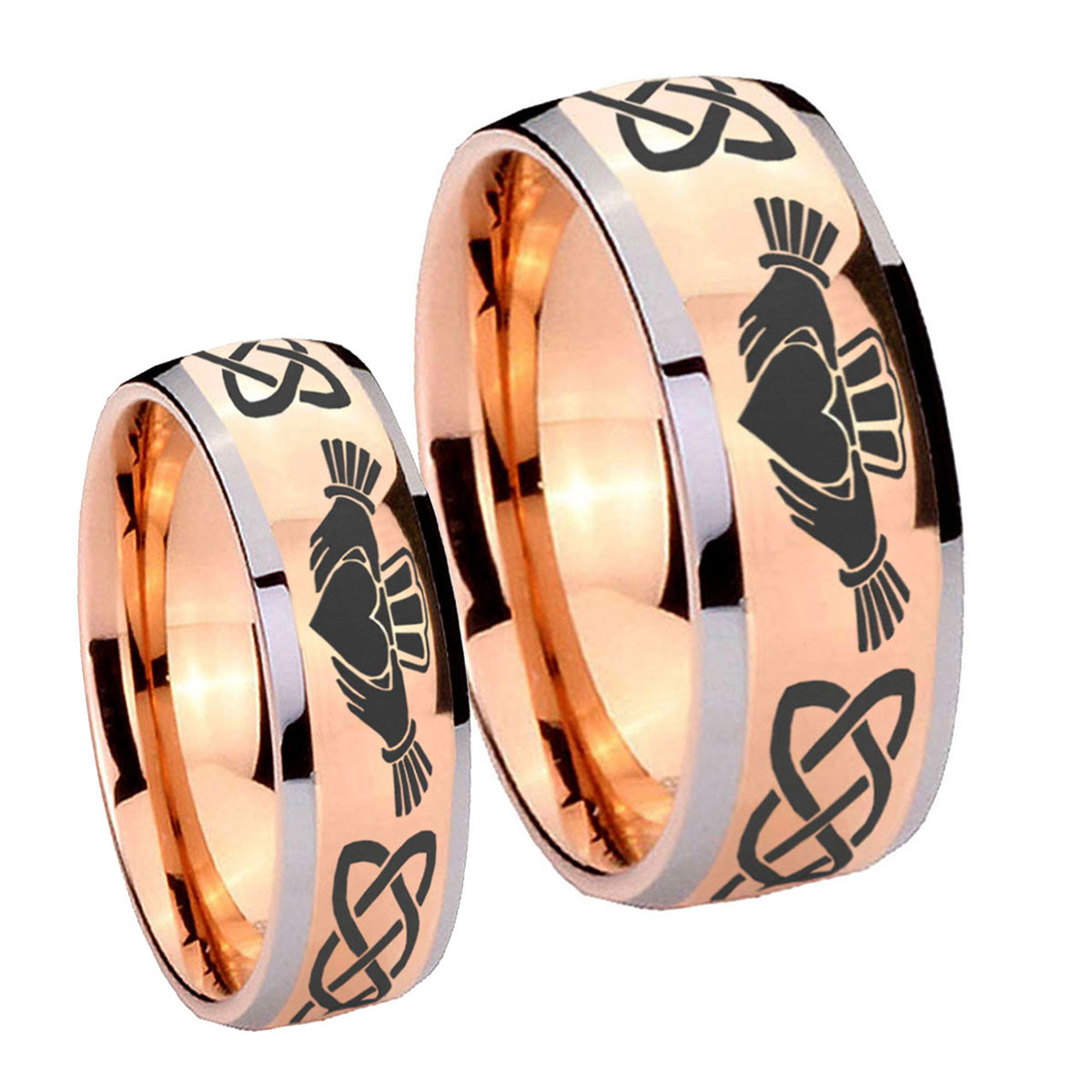 Bride and Groom Irish Claddagh Dome Rose Gold Tungsten Personalized Ring Set