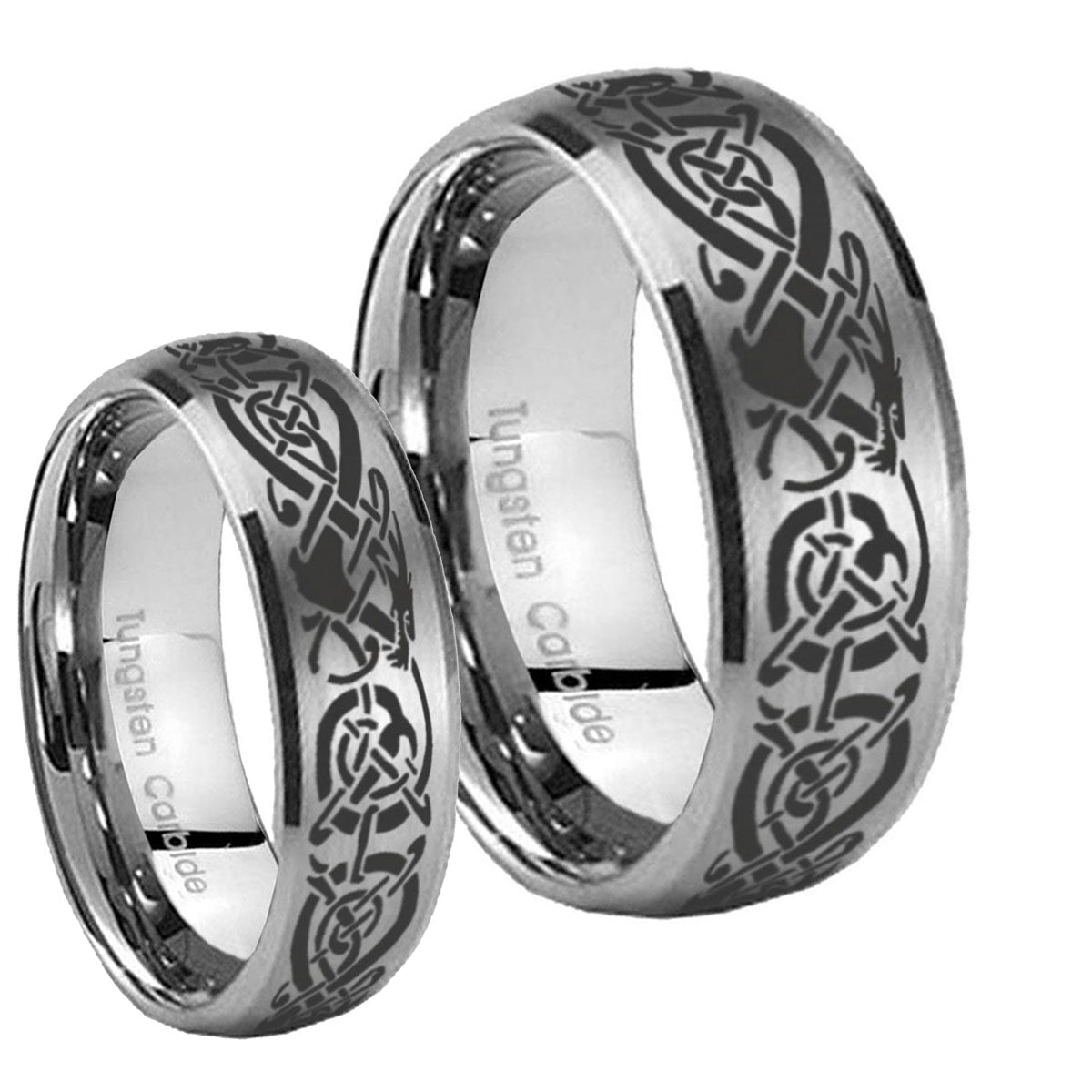 Bride and Groom Celtic Knot Dragon Dome Brushed Tungsten Promise Ring Set