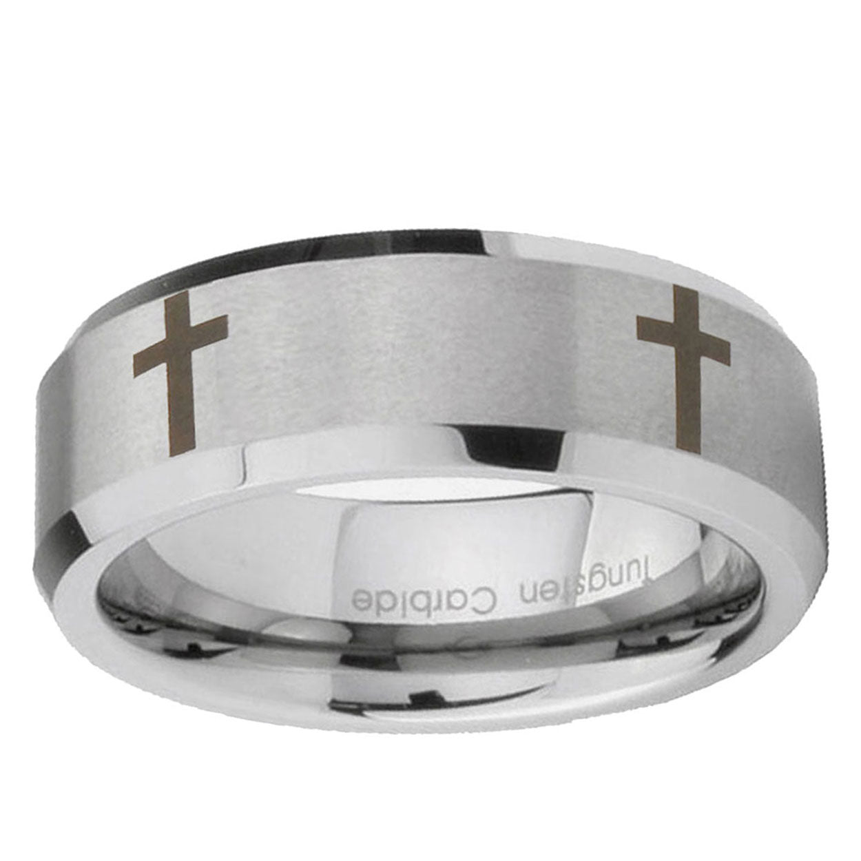 6, 8mm Crosses Beveled Edge Brushed Grey Tungsten Mens Anniversary Ring
