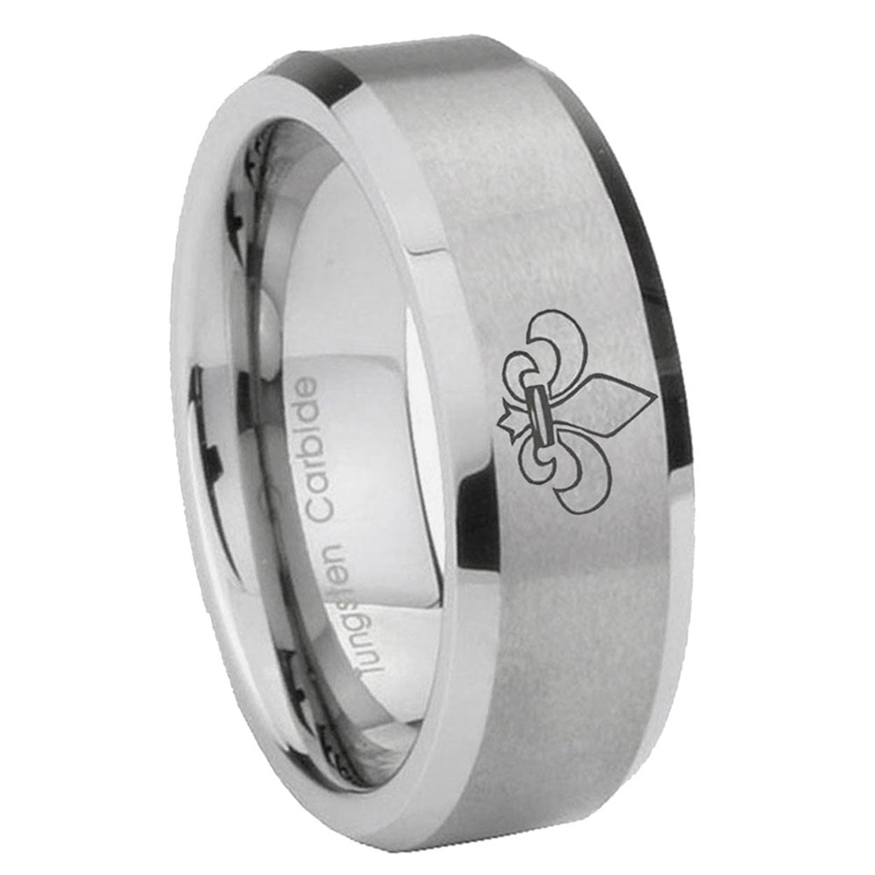 Introducing 6, 8mm Fleur-De-Lis Beveled Edge Brushed Grey Tungsten Wedding Engagement Ring . Offer in both 6mm and 8mm band width brushed grey finished from size 5 to 14