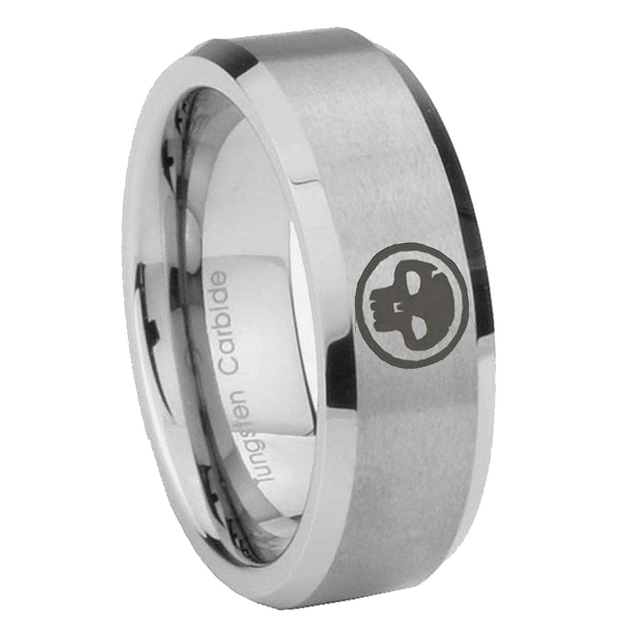 Introducing 6, 8mm Skull Beveled Edge Brushed Grey Tungsten Rings for Men . Offer in both 6mm and 8mm band width brushed grey finished from size 5 to 14