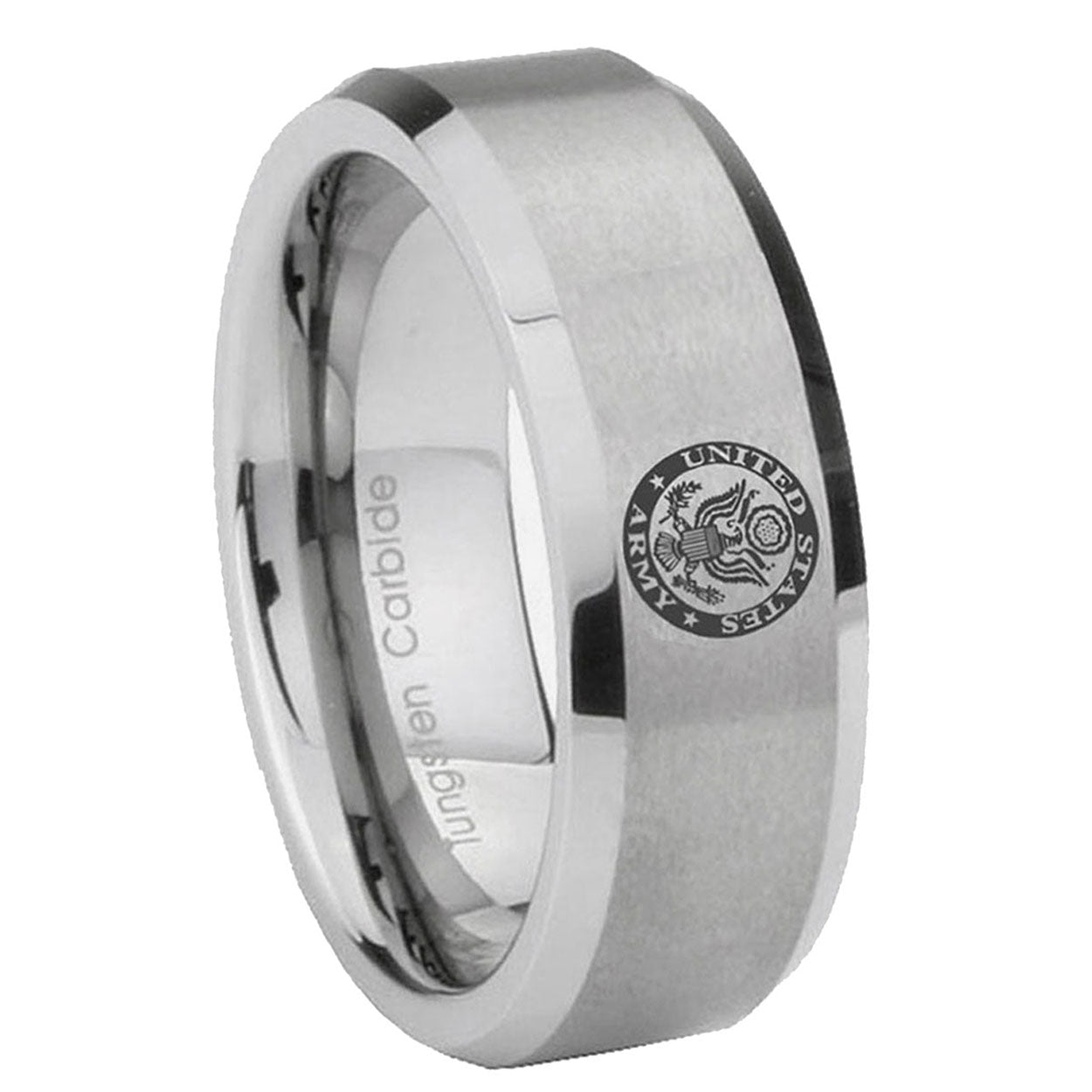 Introducing 6, 8mm U.S. Army Beveled Edge Brushed Grey Tungsten Wedding Engagement Ring . Offer in both 6mm and 8mm band width brushed grey finished from size 5 to 14