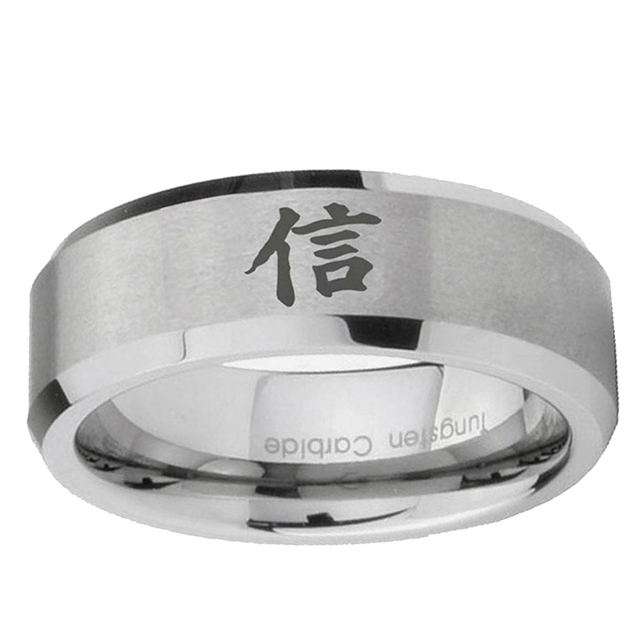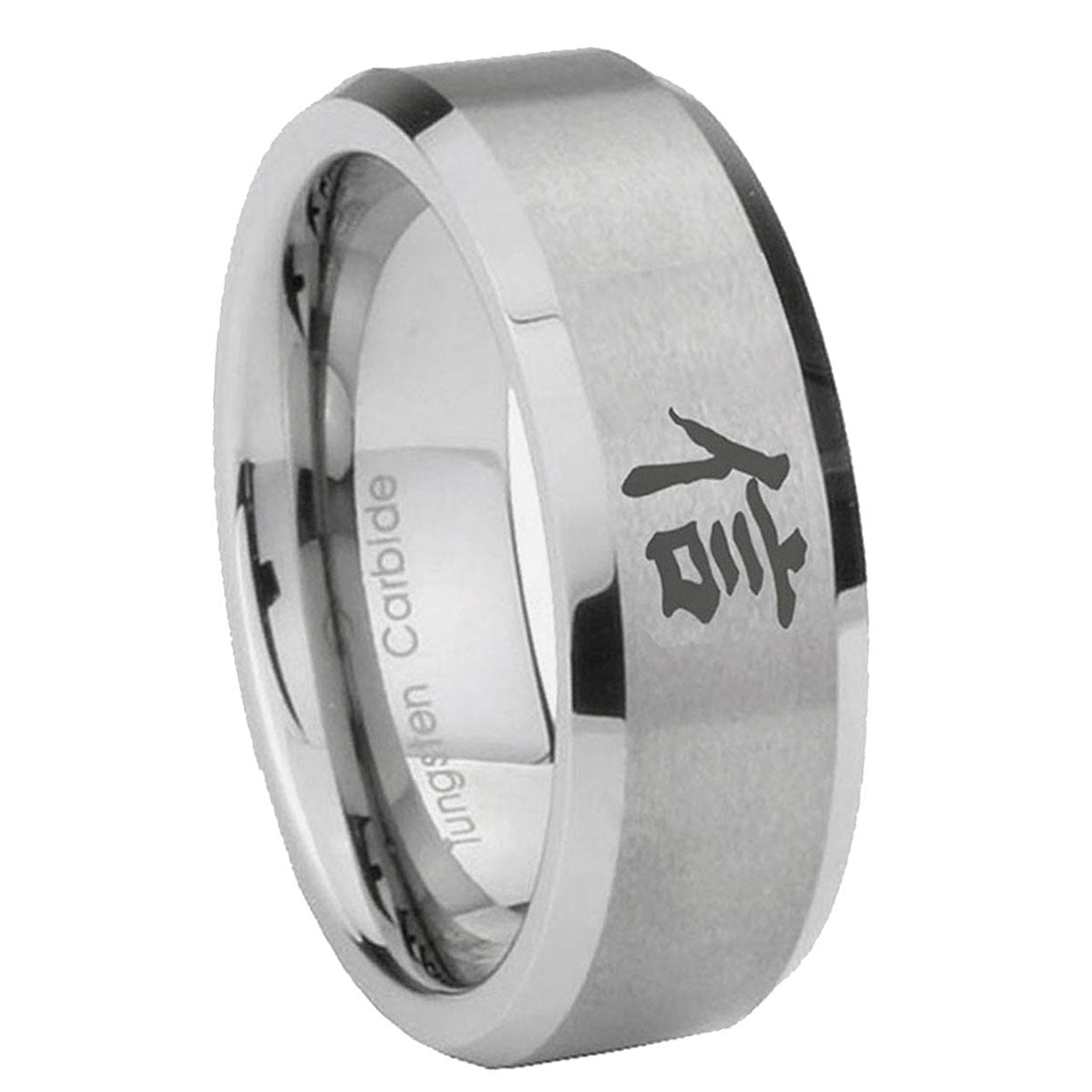 Introducing 6, 8mm Kanji Faith Beveled Edge Brushed Grey Tungsten Men's Engagement Ring . Offer in both 6mm and 8mm band width brushed grey finished from size 5 to 14