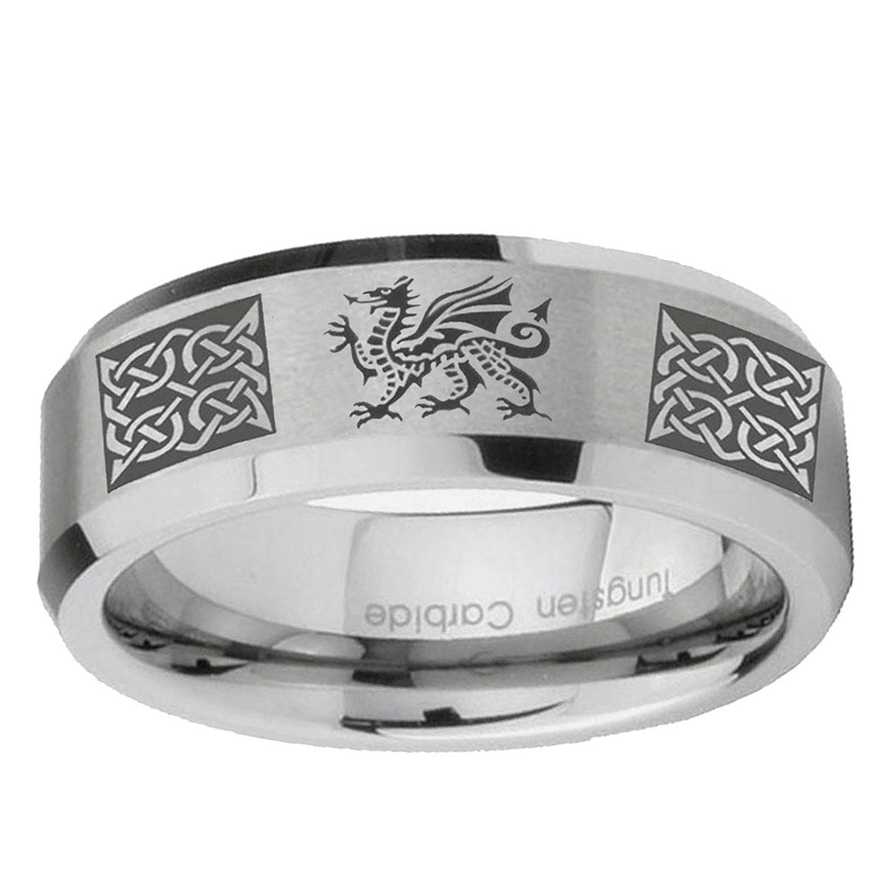 Introducing 6, 8mm Multiple Dragon Celtic Beveled Edge Brushed Grey Tungsten Men's Engagement Ring . Offer in both 6mm and 8mm band width brushed grey finished from size 5 to 14
