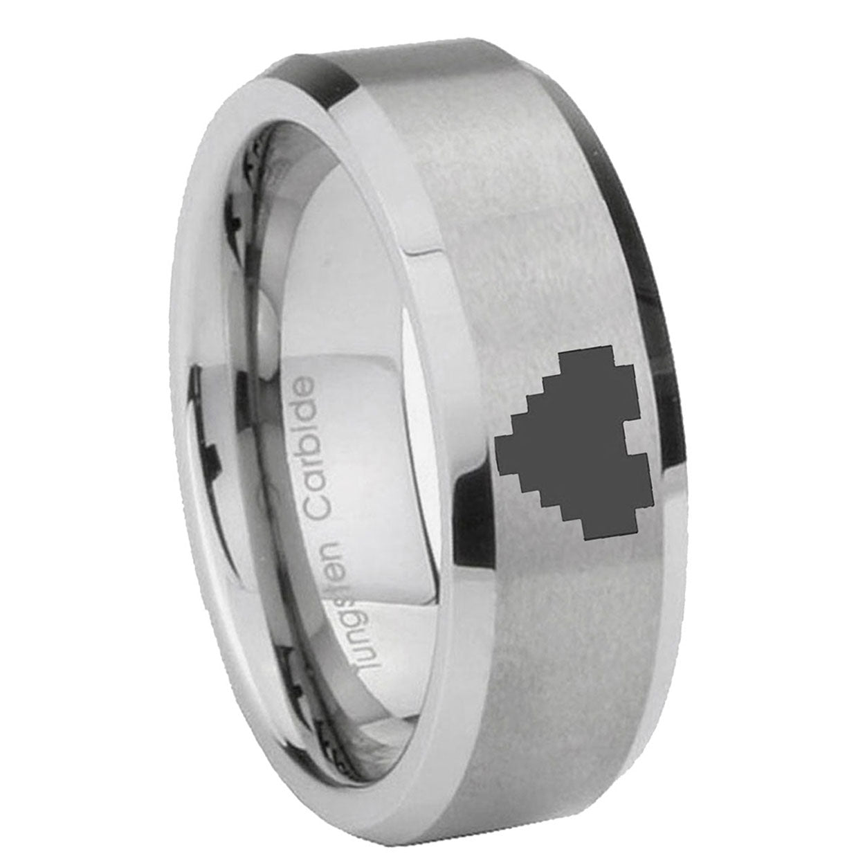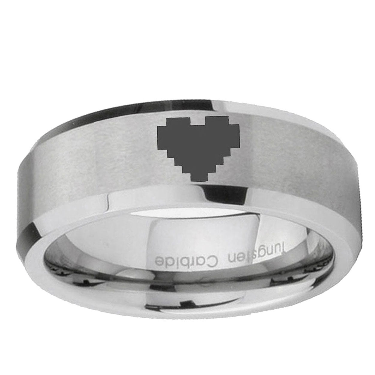 Introducing 6, 8mm Mirror Bevel Edges Zelda Heart Brushed Grey Tungsten Laser Engraved Ring . Offer in both 6mm and 8mm band width brushed grey finished from size 5 to 14