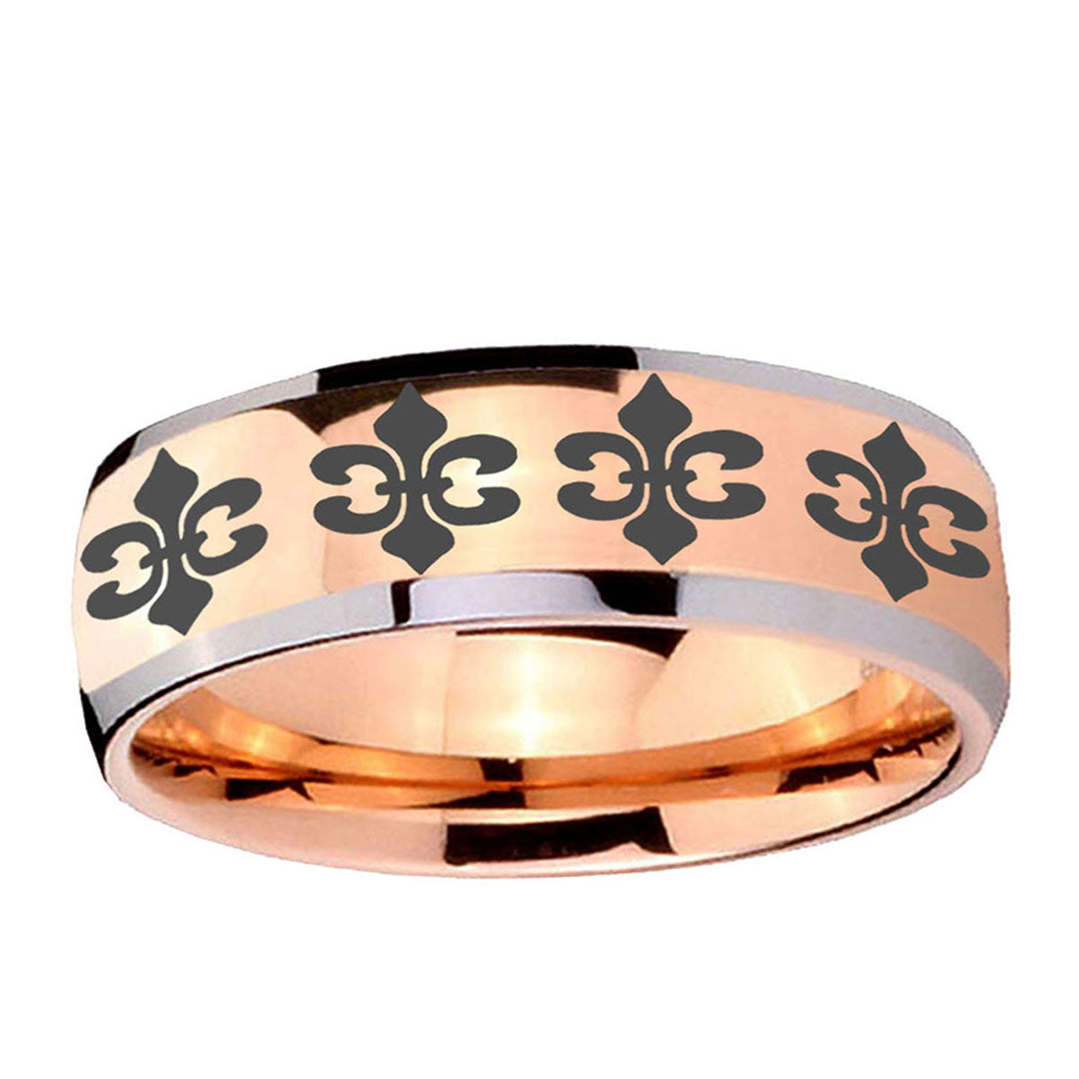 Intruding 5, 8mm Multiple Fleur-De-Lis Dome Rose Gold Tungsten Carbide Men's Engagement Band . Offer in both 5mm and 8mm band width two tone rose gold plated finished from size 4 to 14