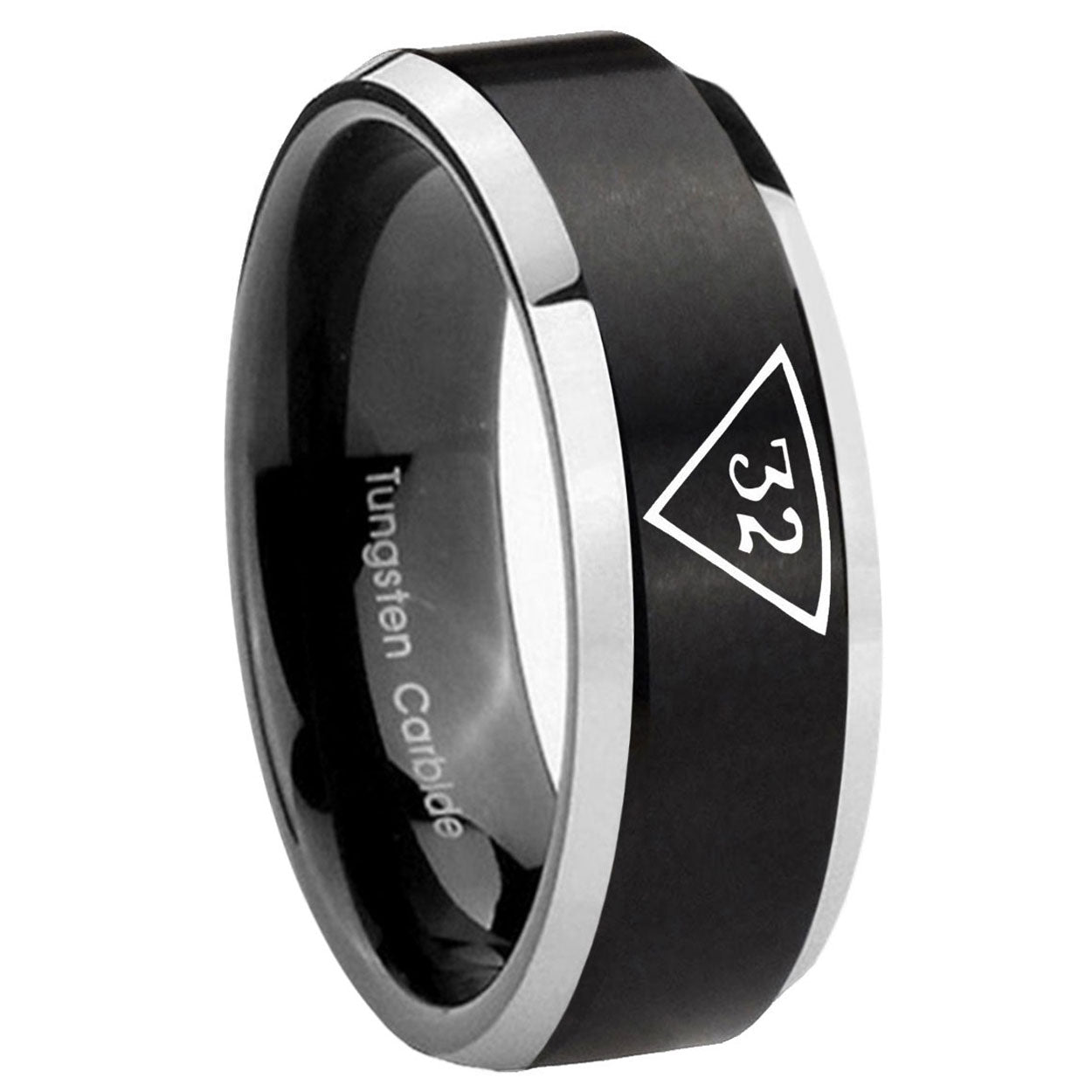 Intruding 5, 8mm Masonic 32 Triangle Freemason Beveled Edges Brush Black 2 Tone Tungsten Carbide Men's Bands Ring . Offer in both 5mm and 8mm band width brushed black plated 2 tone finished from size 4 to 14