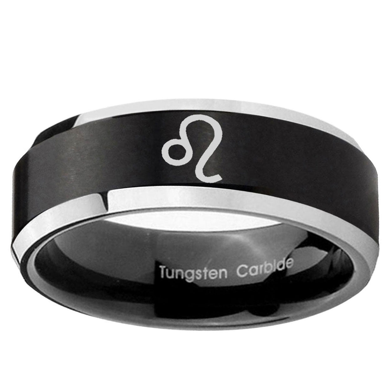 Intruding 5, 8mm Leo Zodiac Beveled Edges Brush Black 2 Tone Tungsten Mens Anniversary Ring . Offer in both 5mm and 8mm band width brushed black plated 2 tone finished from size 4 to 14
