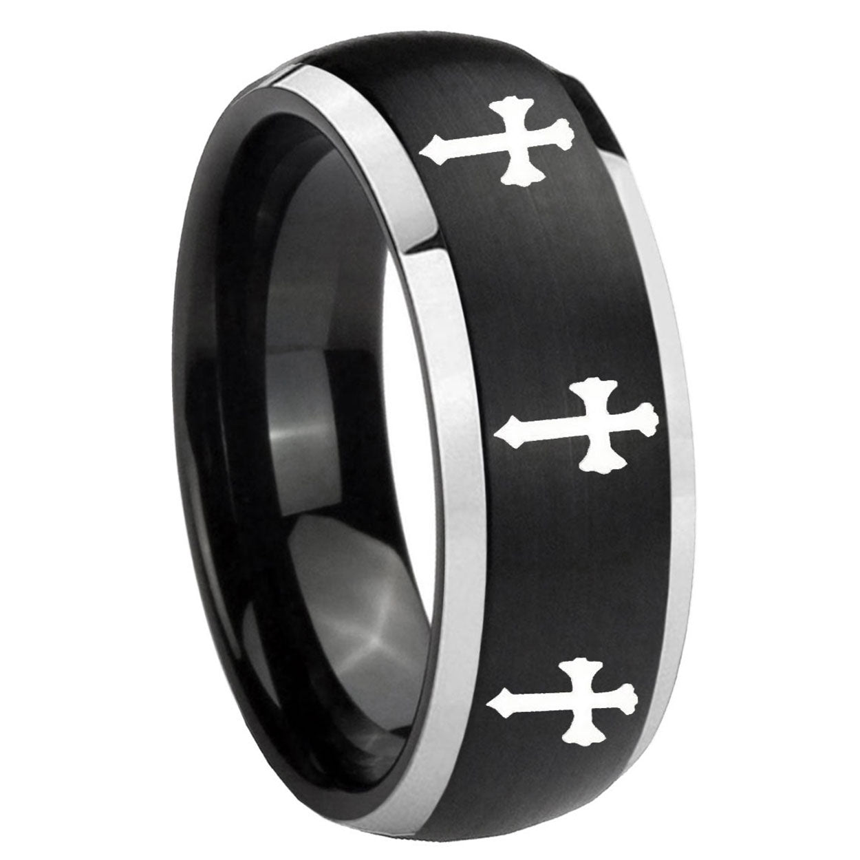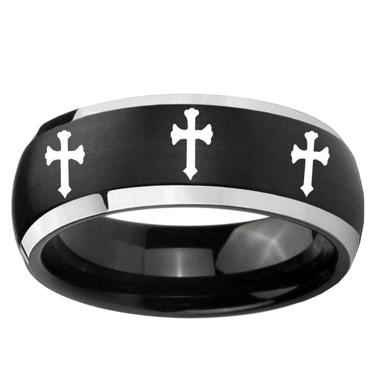 Intruding 5, 8mm Multiple Christian Cross Dome Brushed Black 2 Tone Tungsten Mens Ring . Offer in both 5mm and 8mm band width brushed black plated finished from size 4 to 14