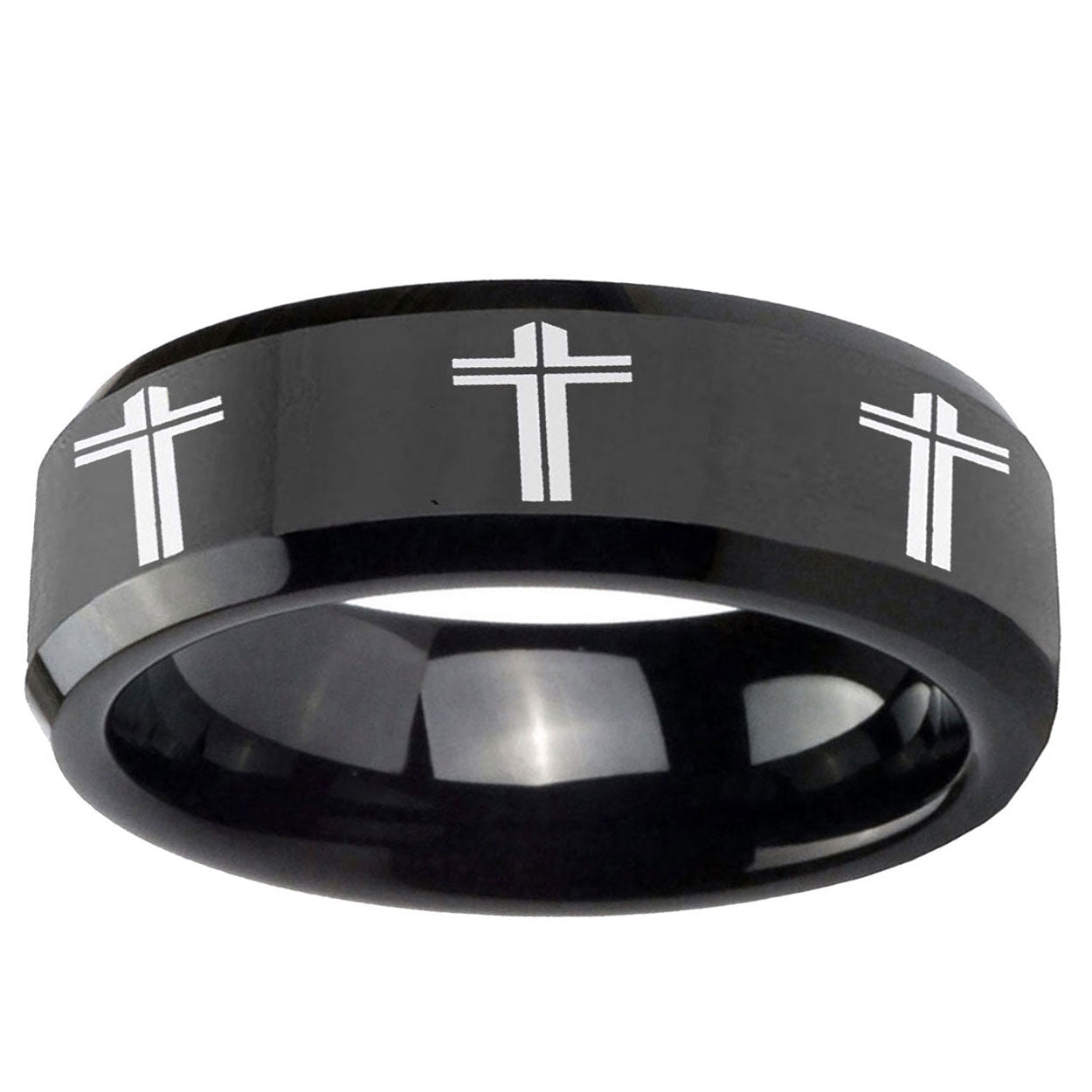 Intruding 5, 8mm Multiple Christian Cross Beveled Edges Black Tungsten Wedding Band Mens . Offer in both 5mm and 8mm band width polished black plated finished from size 4 to 14