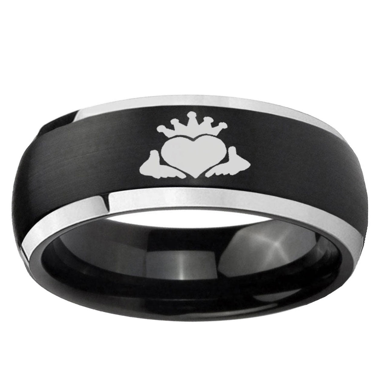5, 8mm Claddagh Design Dome Brushed Black 2 Tone Tungsten Mens Wedding Ring