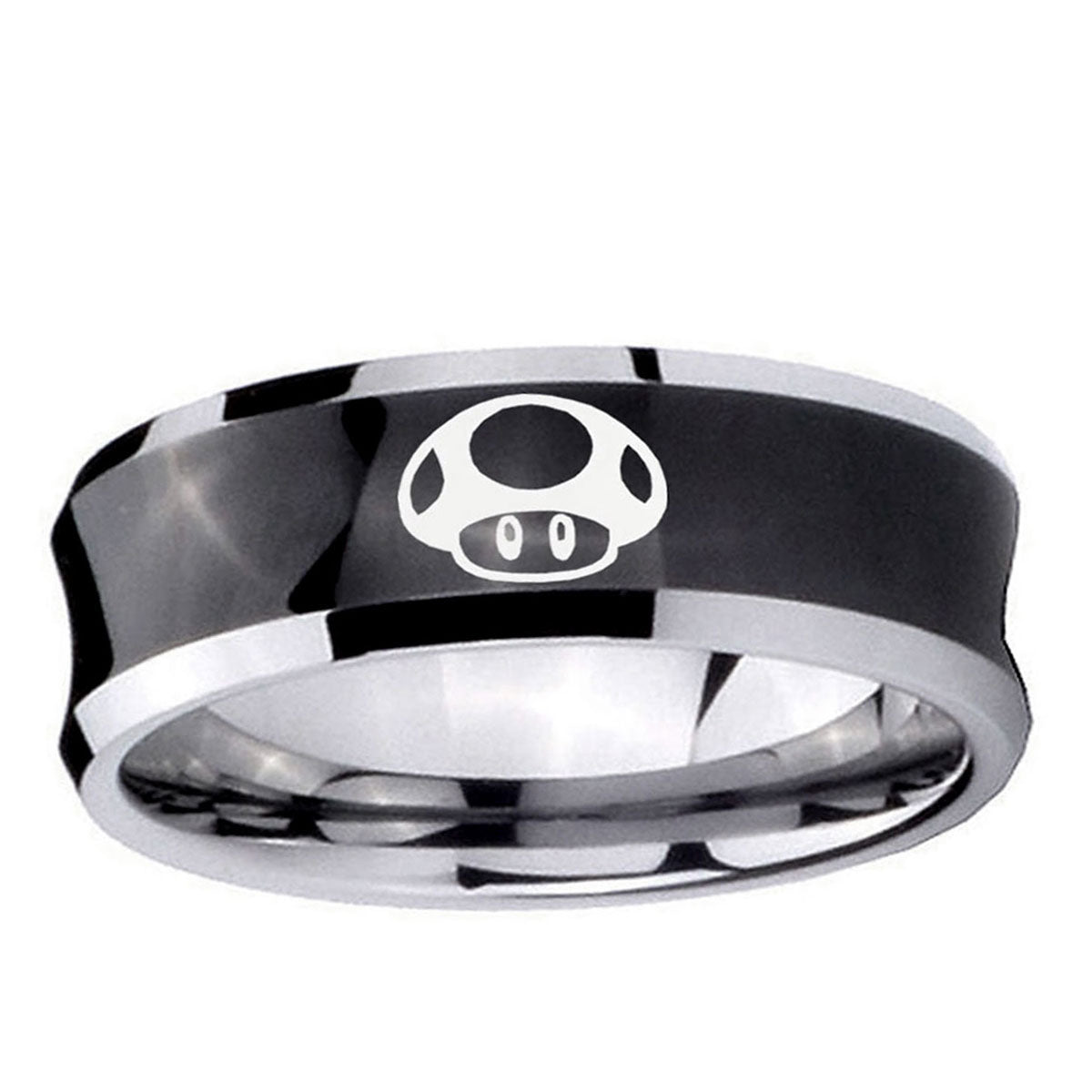 Intruding 5, 8mm Mario Mushroom Concave Black Tungsten Carbide Personalized Ring . Offer in both 5mm and 8mm band width black plated two tone finished from size 4 to 14