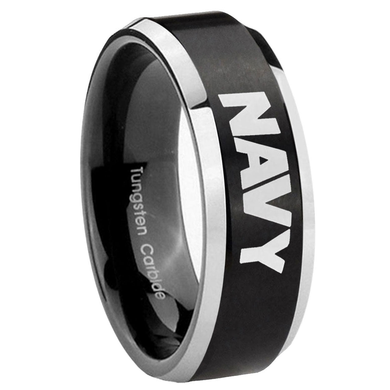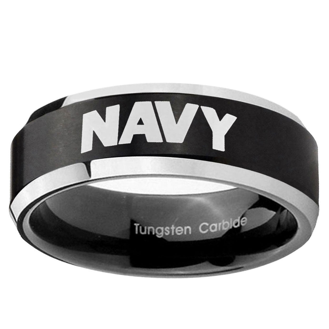 Intruding 5, 8mm Navy Beveled Edges Brush Black 2 Tone Tungsten Carbide Mens Wedding Ring . Offer in both 5mm and 8mm band width brushed black plated 2 tone finished from size 4 to 14