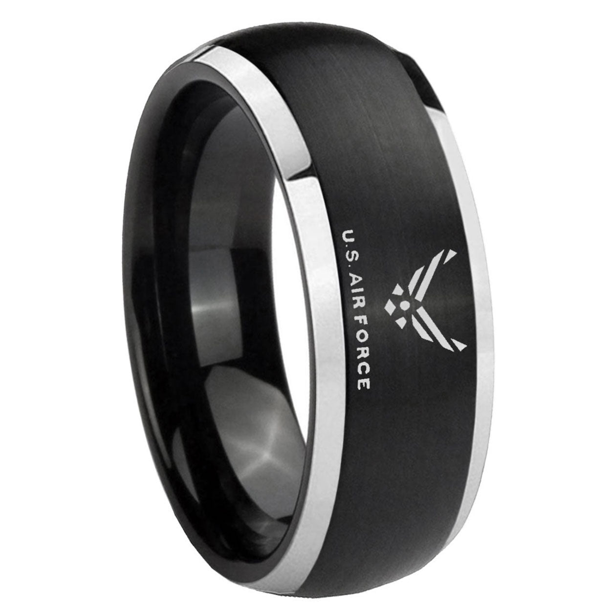 Intruding 5, 8mm Matte Brush Black Dome US Air Force 2 Tone Tungsten Laser Engraved Ring . Offer in both 5mm and 8mm band width brushed black plated finished from size 4 to 14
