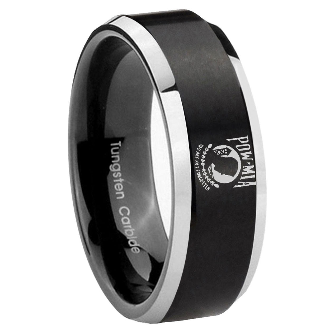 Intruding 5, 8mm Military Pow Beveled Edges Brush Black 2 Tone Tungsten Mens Engagement Ring . Offer in both 5mm and 8mm band width brushed black plated 2 tone finished from size 4 to 14