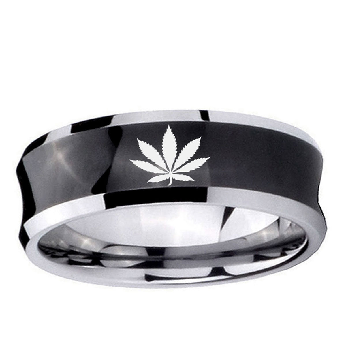 Intruding 5, 8mm Marijuana Leaf Concave Black Tungsten Carbide Personalized Ring . Offer in both 5mm and 8mm band width black plated two tone finished from size 4 to 14