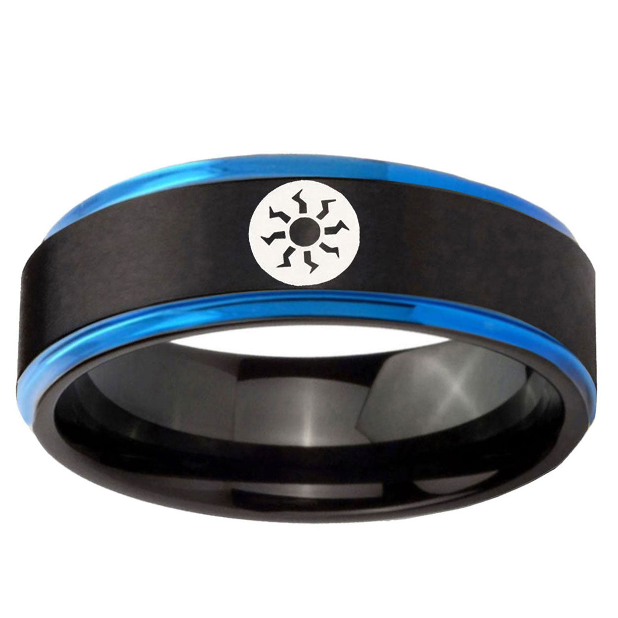 Intruding 5, 8mm Magic The Gathering Blue Step Edge Black Tungsten Mens Anniversary Ring . Offer in both 5mm and 8mm band width black plated finished from size 4 to 14