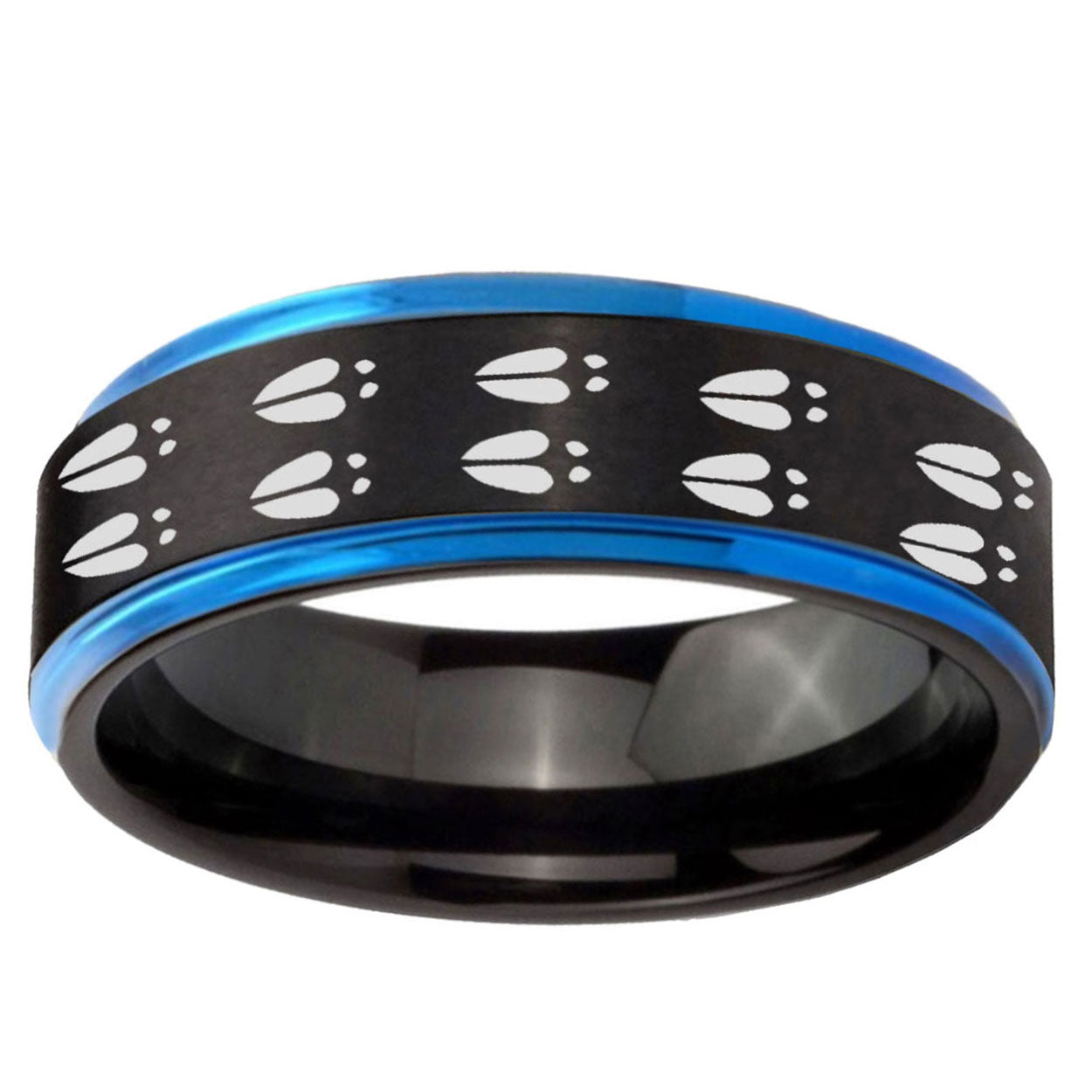 Intruding 5, 8mm Deer Tracks Blue Step Edge Black Tungsten Carbide Men's Wedding Band . Offer in both 5mm and 8mm band width black plated finished from size 4 to 14