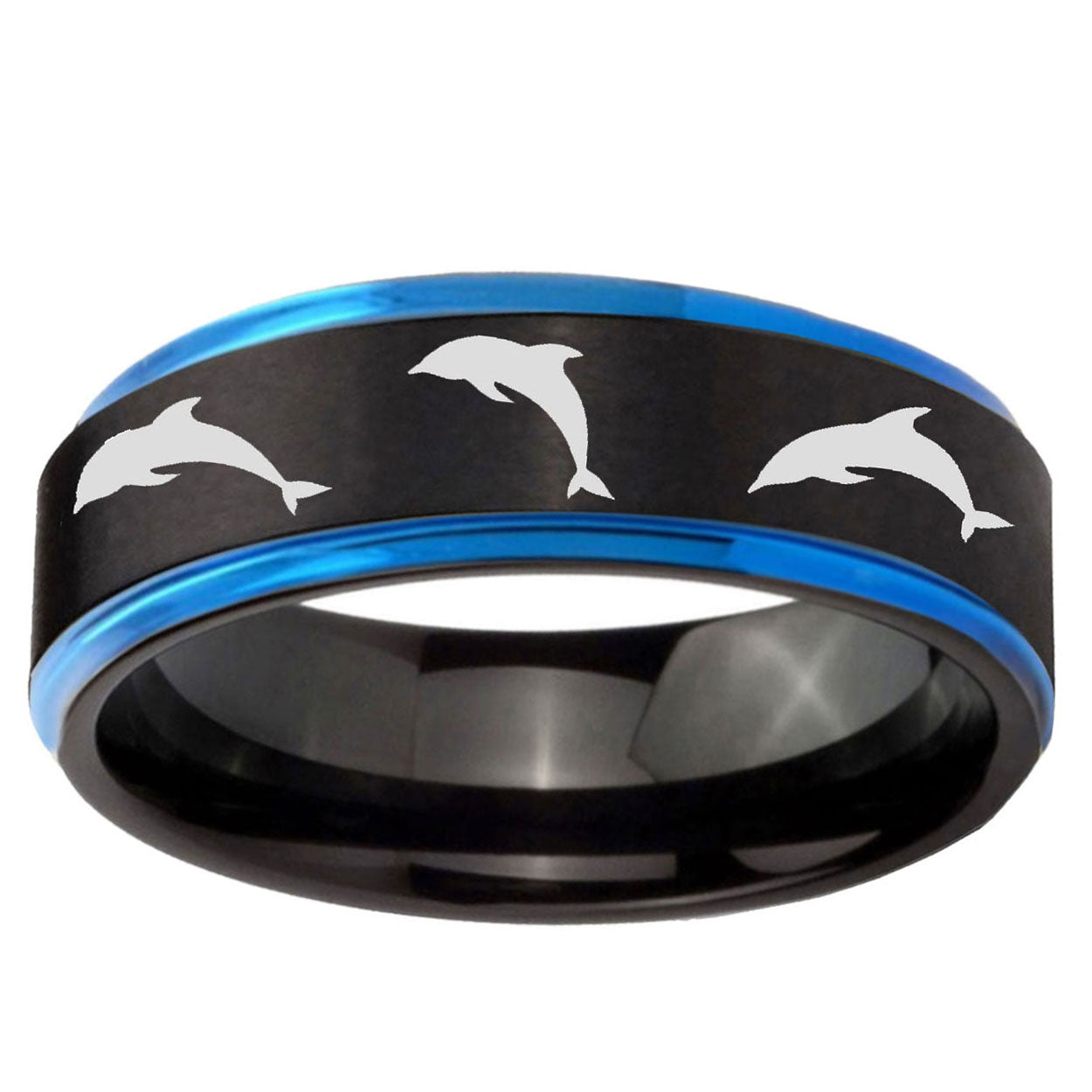 Intruding 5, 8mm Dolphins Blue Step Edge Black Tungsten Carbide Personalized Ring . Offer in both 5mm and 8mm band width black plated finished from size 4 to 14