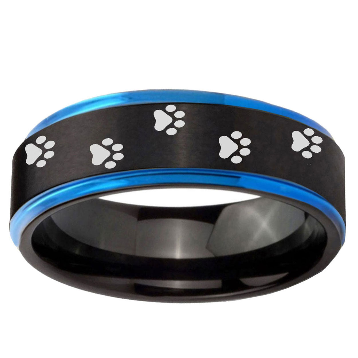 Intruding 5, 8mm Paw Print Blue Step Edge Black Tungsten Carbide Promise Ring . Offer in both 5mm and 8mm band width black plated finished from size 4 to 14