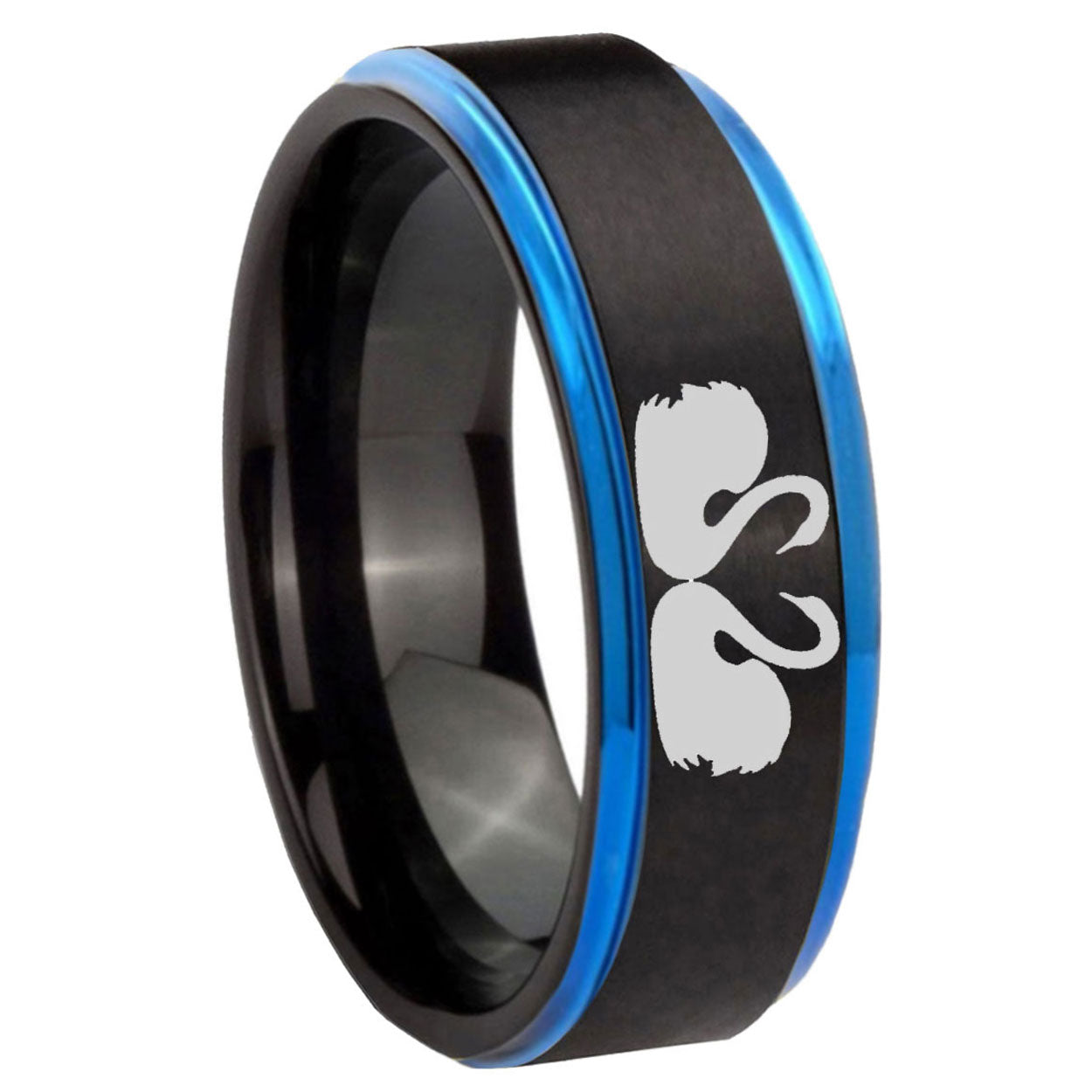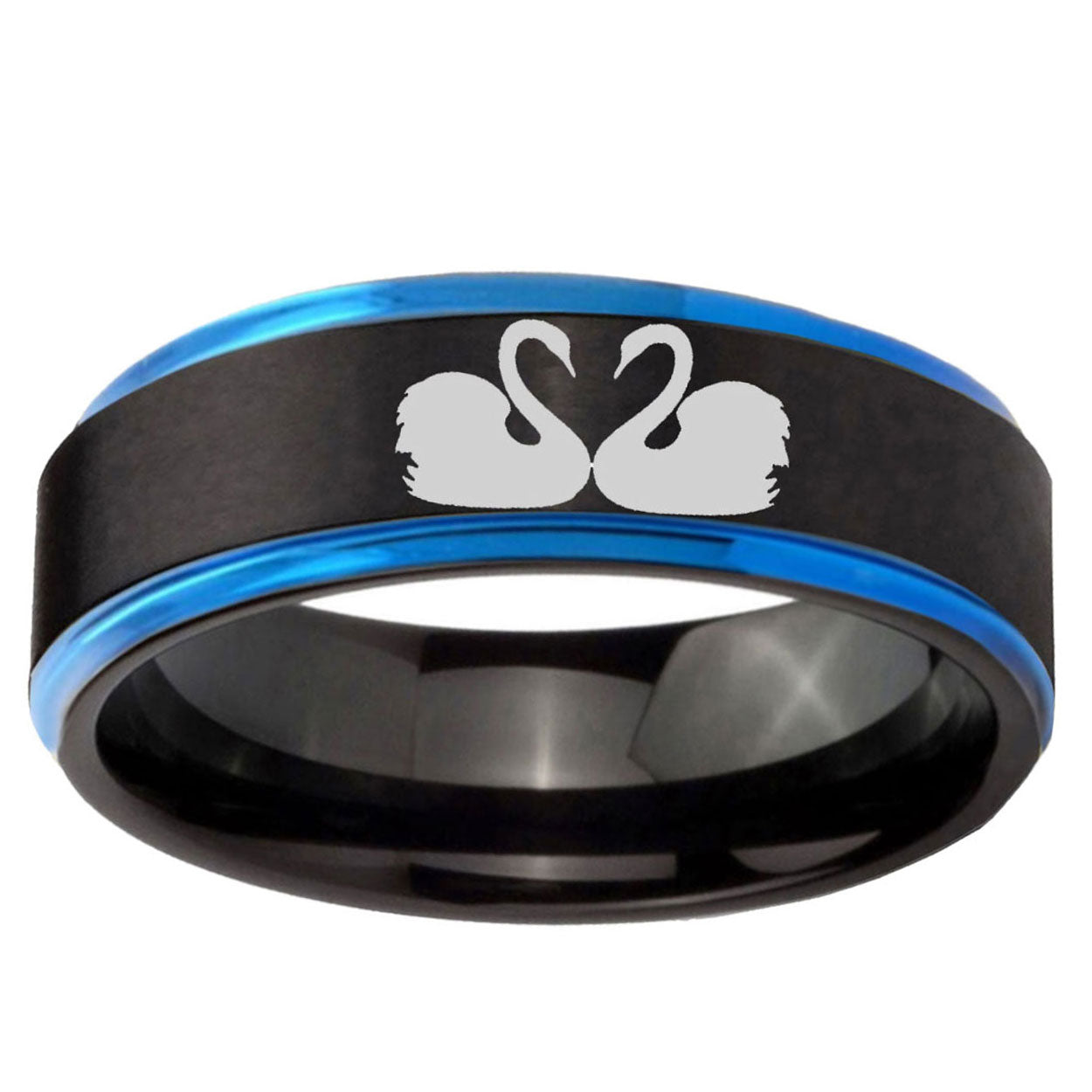 Intruding 5, 8mm Swans Design Blue Step Edges Tungsten Carbide Men's Wedding Ring . Offer in both 5mm and 8mm band width black and blue plated finished from size 4 to 14