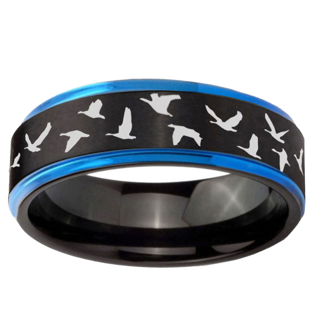Intruding 5, 8mm Flying Geese Hunting Blue Step Edges Tungsten Carbide Men's Wedding Ring . Offer in both 5mm and 8mm band width black and blue plated finished from size 4 to 14
