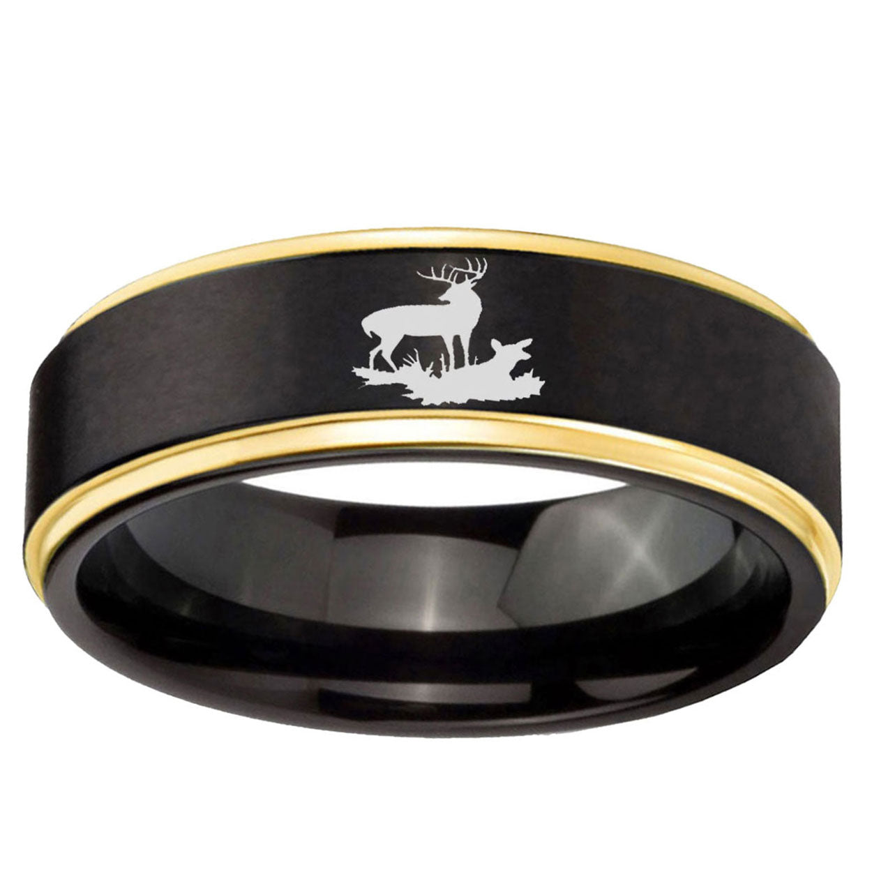 Intruding 6, 8mm Deer Hunting Gold Step Edge Black Tungsten Carbide Mens Wedding Ring . Offer in both 6mm and 8mm band width black plated finished from size 5 to 14