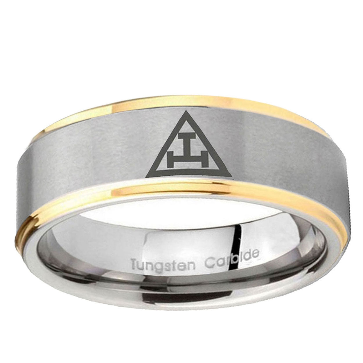 Intruding 5, 8mm Masonic Triple Step Edges Gold 2 Tone Tungsten Carbide Bands Ring . Offer in both 5mm and 8mm band width grey and gold 2 tone finished from size 4 to 14