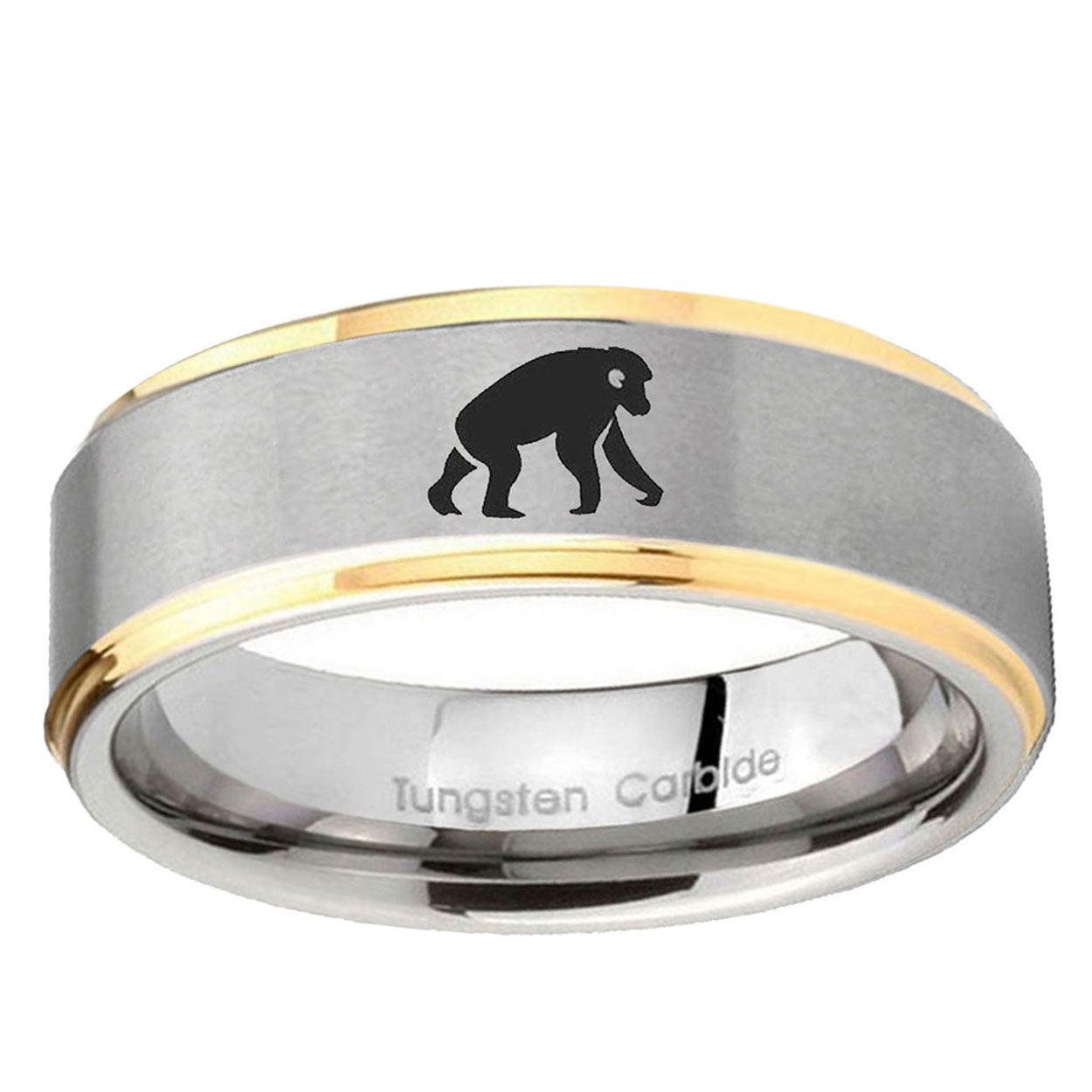 Intruding 5, 8mm Chimpanzee Step Edges Gold 2 Tone Tungsten Carbide Mens Ring . Offer in both 5mm and 8mm band width grey and gold 2 tone finished from size 4 to 14