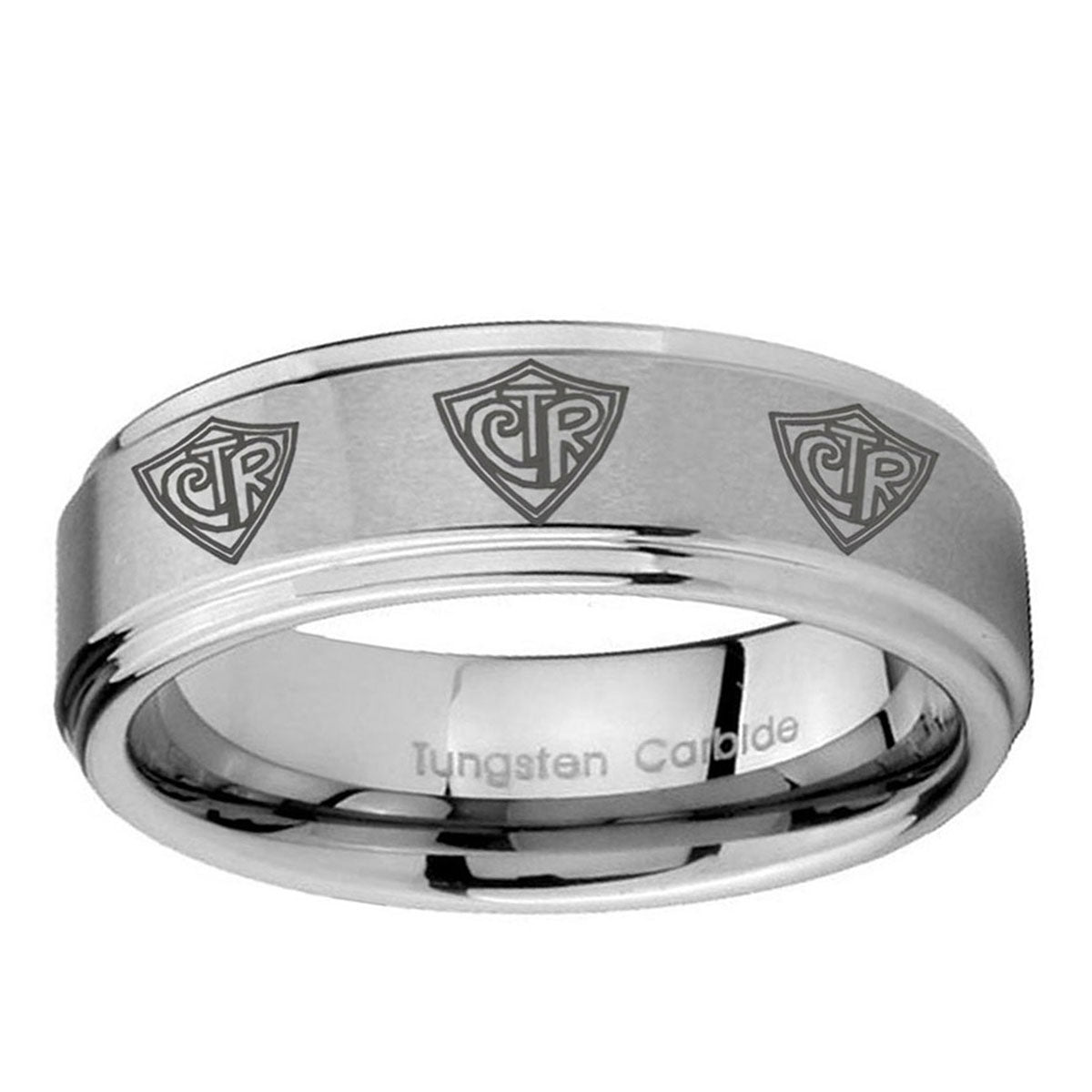 Intruding 5, 8mm Multiple CTR Step Edges Brushed Silver Tungsten Carbide Men's Engagement Ring . Offer in both 5mm and 8mm band width brushed grey finished from size 4 to 14