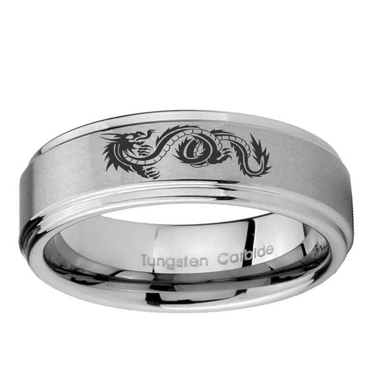 Intruding 5, 8mm Dragon Step Edges Brushed Silver Tungsten Carbide Men's Wedding Band . Offer in both 5mm and 8mm band width brushed grey finished from size 4 to 14