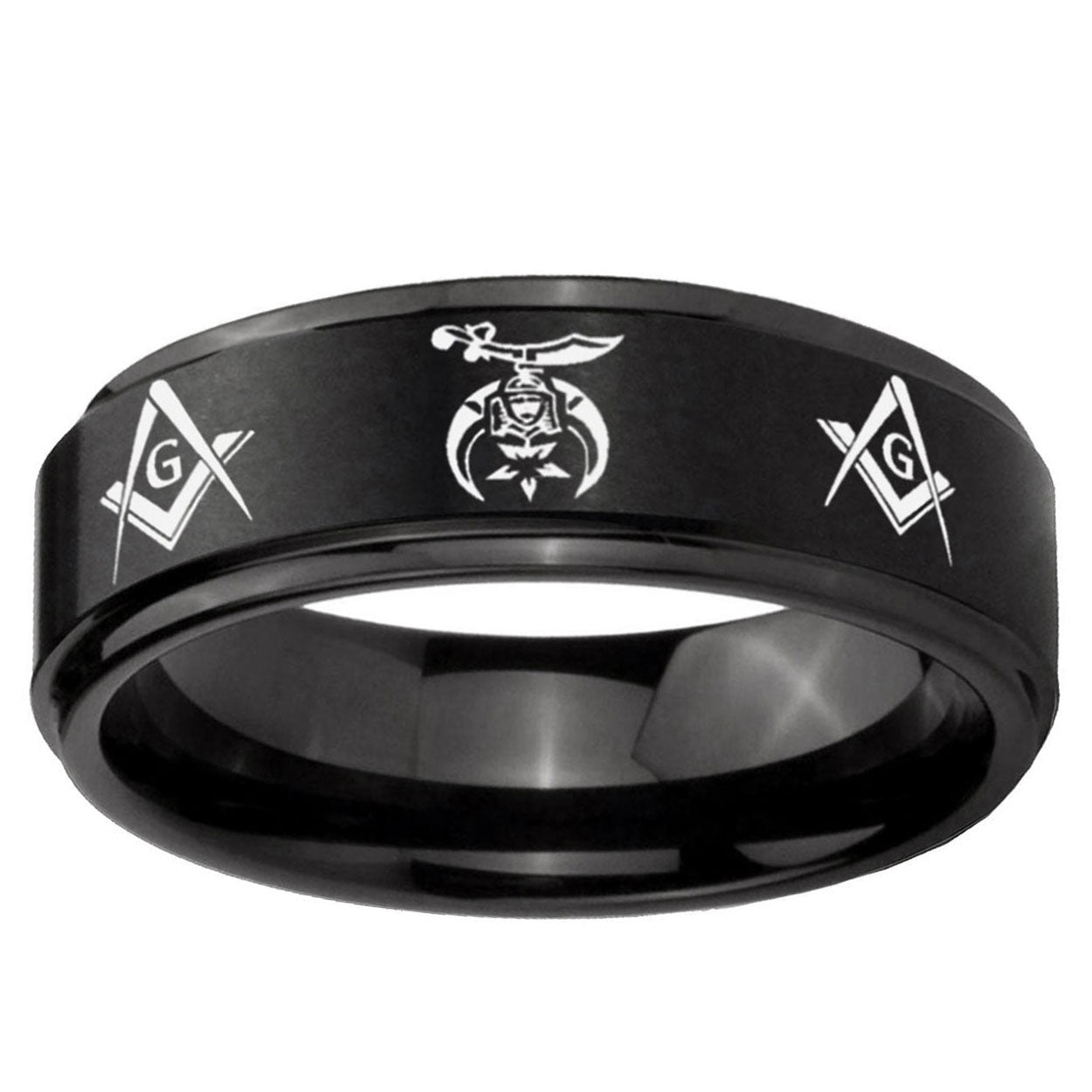 Intruding 5, 8mm Masonic Shriners Step Edges Brush Black Tungsten Carbide Men's Wedding Band . Offer in both 5mm and 8mm band width brush black plated finished from size 4 to 14