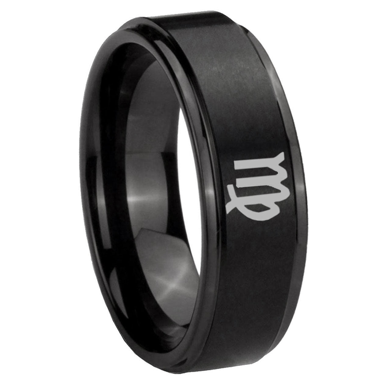 Intruding 5, 8mm Virgo Zodiac Step Edges Brush Black Tungsten Carbide Mens Anniversary Ring . Offer in both 5mm and 8mm band width brush black plated finished from size 4 to 14