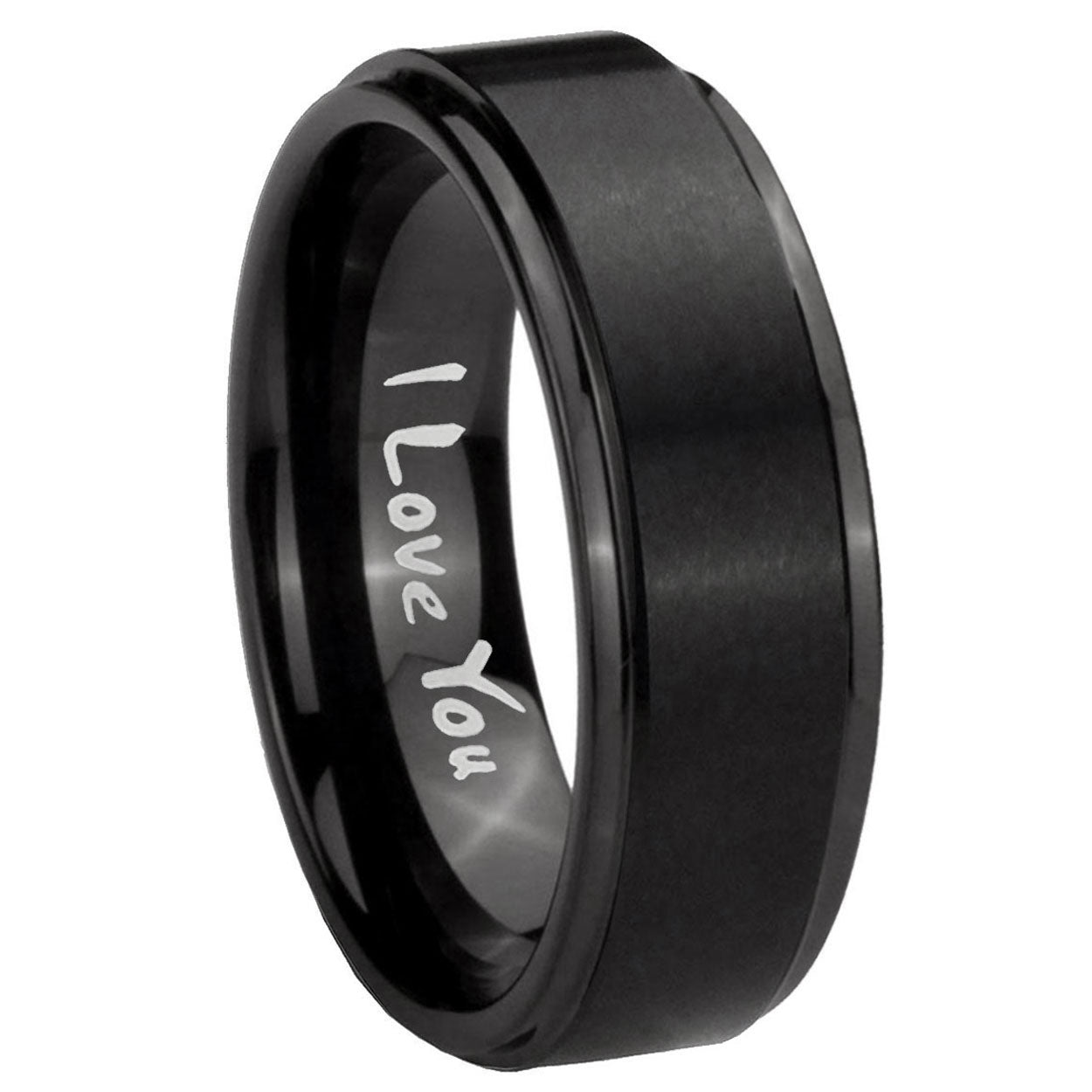 Intruding 5, 8mm I Love You Step Edges Brush Black Tungsten Carbide Men's Wedding Ring . Offer in both 5mm and 8mm band width brush black plated finished from size 4 to 14
