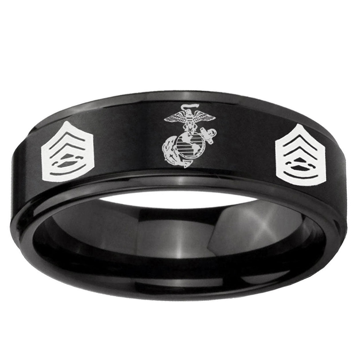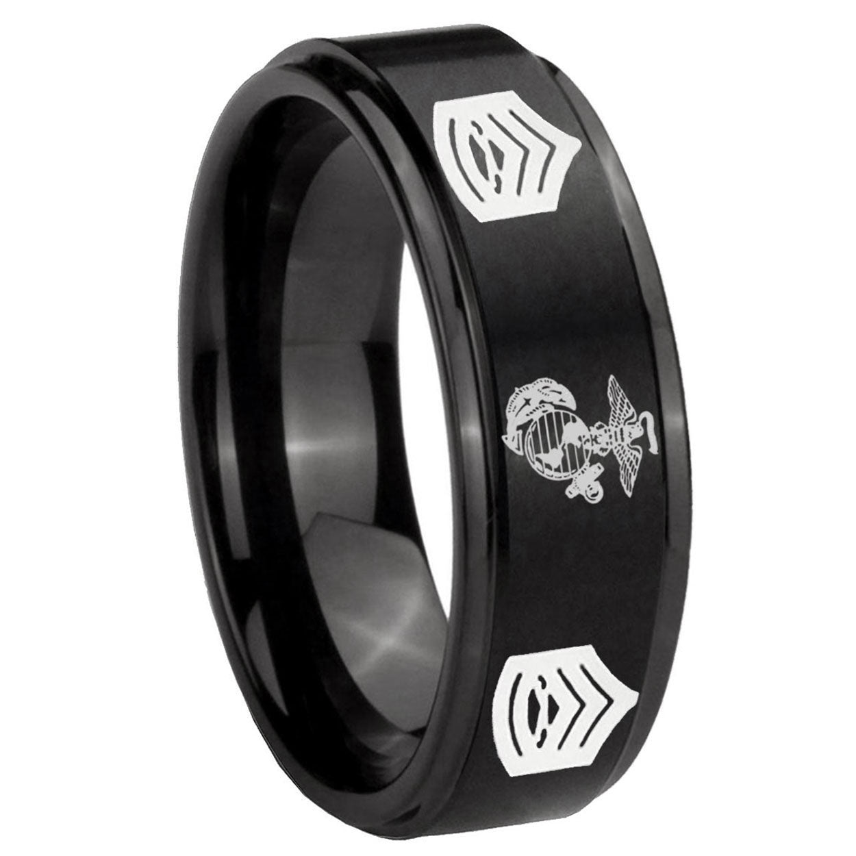 Intruding 5, 8mm Marine Army Sergeant Step Edges Brush Black Tungsten Carbide Mens Bands Ring . Offer in both 5mm and 8mm band width brush black plated finished from size 4 to 14
